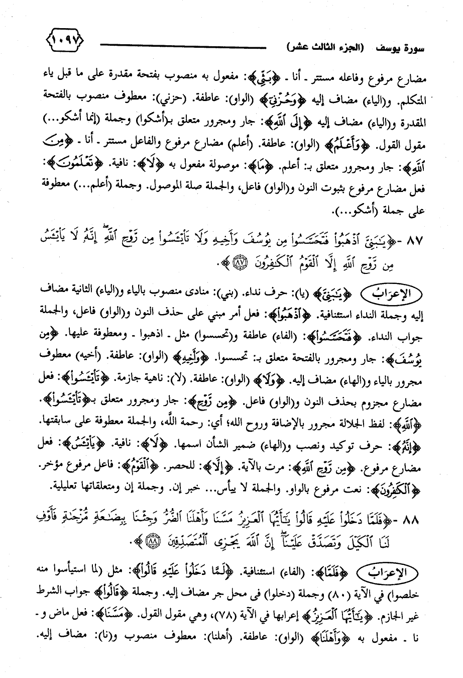 الإعراب {يا بَنِيَّ} (يا): حرف نداء. (بني): منادى منصوب بالياء و (الياء) الثانية مضاف إليه وجملة النداء استئنافية. {اِذْهَبُوا}: فعل أمر مبني على حذف النون و (الواو) فاعل، والجملة جواب النداء. {فَتَحَسَّسُوا}: (الفاء) عاطفة و (تحسسوا) مثل-اذهبوا-ومعطوفة عليها. {مِنْ يُوسُفَ}: جار ومجرور بالفتحة متعلق ب: تحسسوا. {وَأَخِيهِ} (الواو): عاطفة. (أخيه) معطوف مجرور بالياء و (الهاء) مضاف إليه. {وَلا} (الواو): عاطفة. (لا): ناهية جازمة. {تَيْأَسُوا}: فعل مضارع مجزوم بحذف النون و (الواو) فاعل. {مِنْ رَوْحِ}: جار ومجرور متعلق ب {تَيْأَسُوا}.