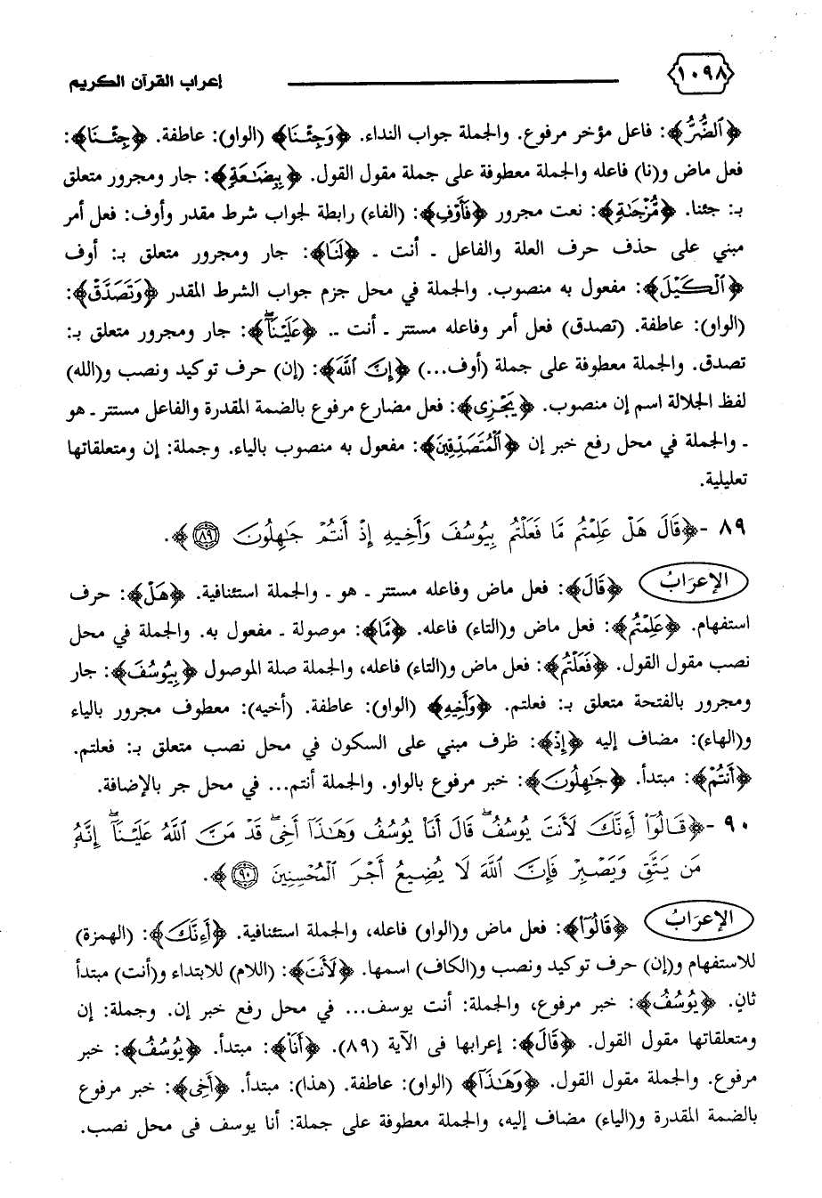 الإعراب {قالَ}: فعل ماض وفاعله مستتر-هو-والجملة استئنافية. {هَلْ}: حرف استفهام. {عَلِمْتُمْ}: فعل ماض و (التاء) فاعله. {ما}: موصولة-مفعول به. والجملة في محل نصب مقول القول. {فَعَلْتُمْ}: فعل ماض و (التاء) فاعله، والجملة صلة الموصول {بِيُوسُفَ}: جار ومجرور بالفتحة متعلق ب: فعلتم. {وَأَخِيهِ} (الواو): عاطفة. (أخيه): معطوف مجرور بالياء و (الهاء): مضاف إليه {إِذْ}: ظرف مبني على السكون في محل نصب متعلق ب: فعلتم.