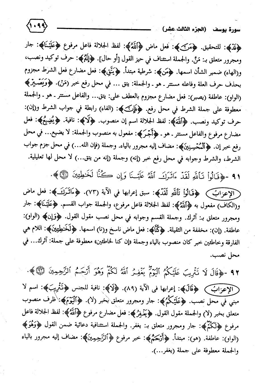 الإعراب {قالَ}: إعرابها فى الآية (٨٩). {لا}: نافية للجنس {تَثْرِيبَ}: اسم لا مبني في محل نصب. {عَلَيْكُمُ}: جار ومجرور متعلق بخبر (لا). {الْيَوْمَ}: ظرف منصوب متعلق بخبر (لا) والجملة مقول القول. {يَغْفِرُ}: فعل مضارع مرفوع {اللهُ}: لفظ الجلالة فاعل مرفوع {لَكُمْ}: جار ومجرور متعلق ب: يغفر. والجملة استئنافية دعائية ضمن القول {وَهُوَ} (الواو): عاطفة. (هو): مبتدأ. {أَرْحَمُ}: خبر مرفوع {الرّاحِمِينَ}: مضاف إليه مجرور بالياء والجملة معطوفة على جملة (يغفر ... ).