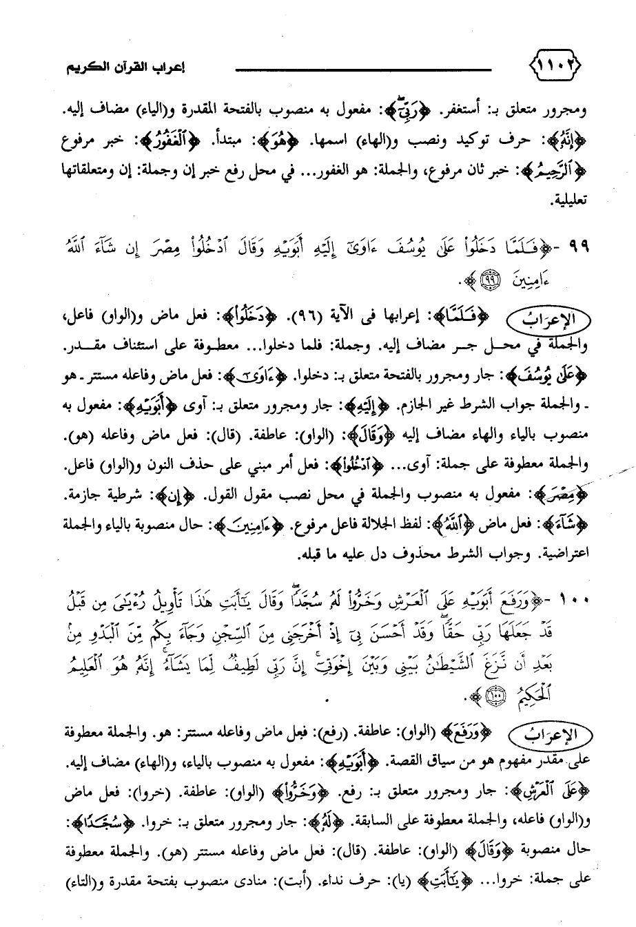 الإعراب {وَرَفَعَ} (الواو): عاطفة. (رفع): فعل ماض وفاعله مستتر: هو. والجملة معطوفة على مقدر مفهوم هو من سياق القصة. {أَبَوَيْهِ}: مفعول به منصوب بالياء، و (الهاء) مضاف إليه.