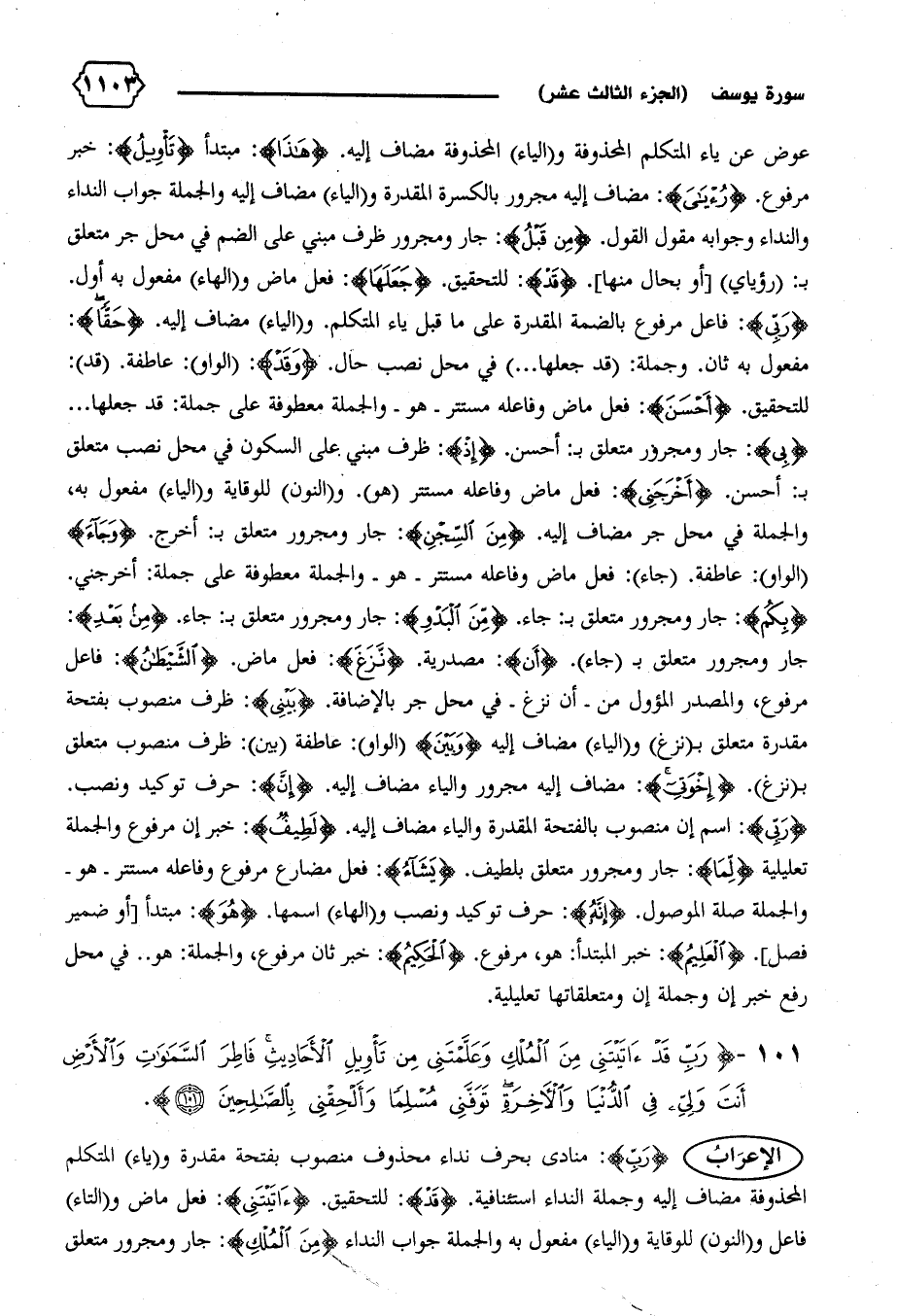 الإعراب {رَبِّ}: منادى بحرف نداء محذوف منصوب بفتحة مقدرة و (ياء) المتكلم المحذوفة مضاف إليه وجملة النداء استئنافية. {قَدْ}: للتحقيق. {آتَيْتَنِي}: فعل ماض و (التاء) فاعل و (النون) للوقاية و (الياء) مفعول به والجملة جواب النداء {مِنَ الْمُلْكِ}: جار ومجرور متعلق