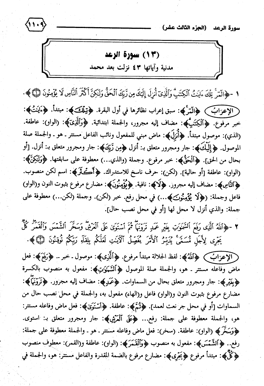 الإعراب {المر}: سبق إعراب نظائرها في أول البقرة. {تِلْكَ}: مبتدأ. {آياتُ}: