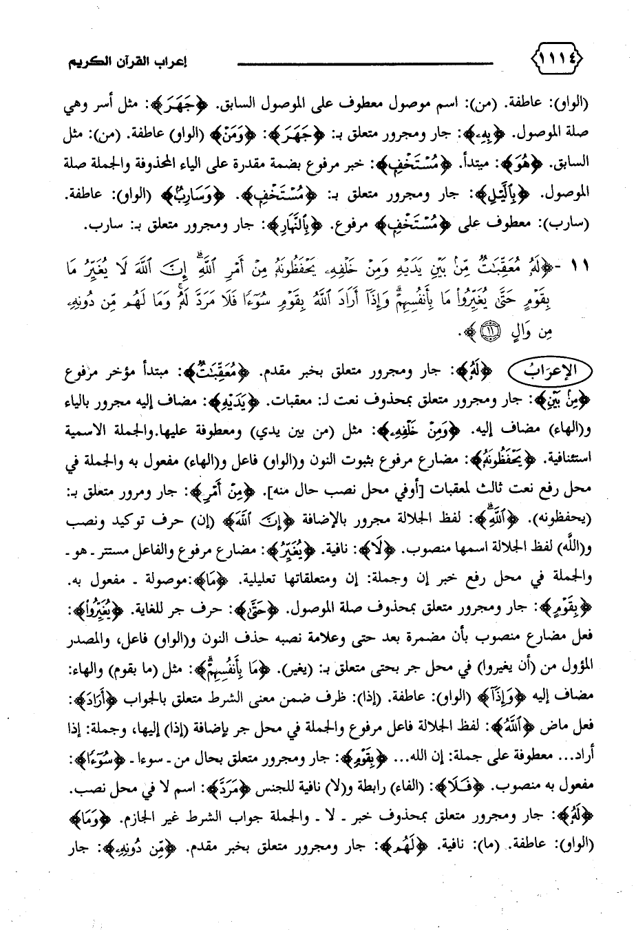 الإعراب {لَهُ}: جار ومجرور متعلق بخبر مقدم. {مُعَقِّباتٌ}: مبتدأ مؤخر مرفوع {مِنْ بَيْنِ}: جار ومجرور متعلق بمحذوف نعت ل: معقبات. {يَدَيْهِ}: مضاف إليه مجرور بالياء و (الهاء) مضاف إليه. {وَمِنْ خَلْفِهِ}: مثل (من بين يدي) ومعطوفة عليها. والجملة الاسمية استئنافية. {يَحْفَظُونَهُ}: مضارع مرفوع بثبوت النون و (الواو) فاعل و (الهاء) مفعول به والجملة في محل رفع نعت ثالث لمعقبات [أو في محل نصب حال منه]. {مِنْ أَمْرِ}: جار ومجرور متعلق ب: