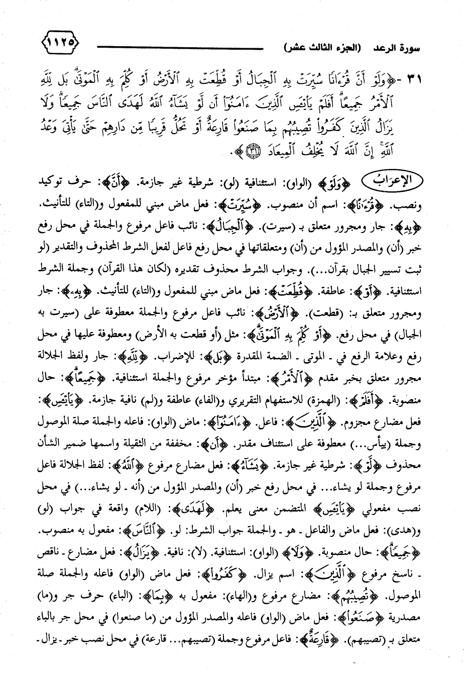 الإعراب {وَلَوْ} (الواو): استئنافية (لو): شرطية غير جازمة. {أَنَّ}: حرف توكيد ونصب. {قُرْآناً}: اسم أن منصوب. {سُيِّرَتْ}: فعل ماض مبني للمفعول و (التاء) للتأنيث.