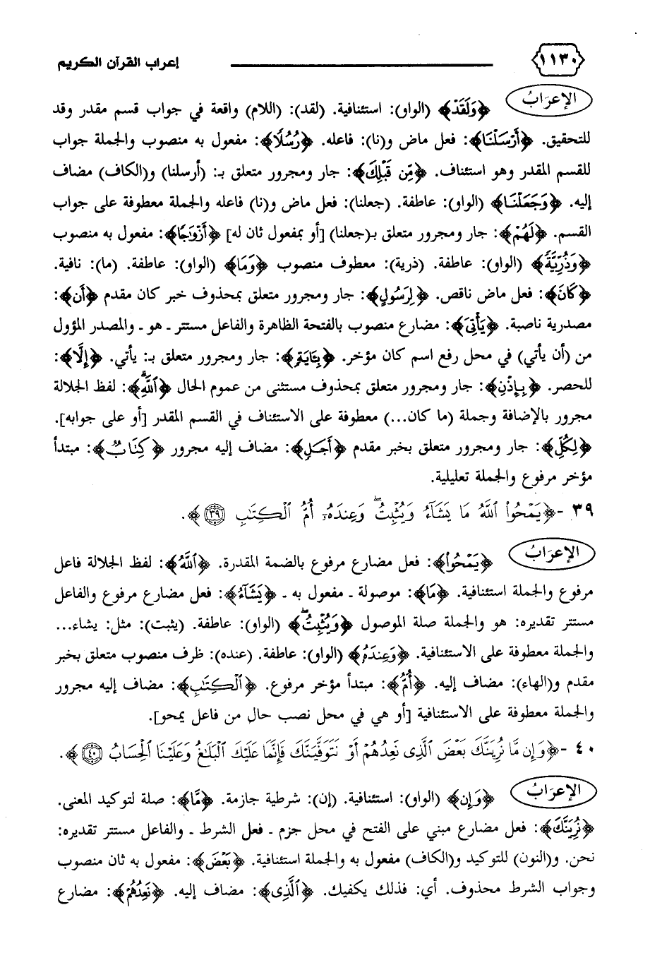 الإعراب {يَمْحُوا}: فعل مضارع مرفوع بالضمة المقدرة. {اللهُ}: لفظ الجلالة فاعل مرفوع والجملة استئنافية. {ما}: موصولة-مفعول به- {يَشاءُ}: فعل مضارع مرفوع والفاعل مستتر تقديره: هو والجملة صلة الموصول {وَيُثْبِتُ} (الواو): عاطفة. (يثبت): مثل: يشاء