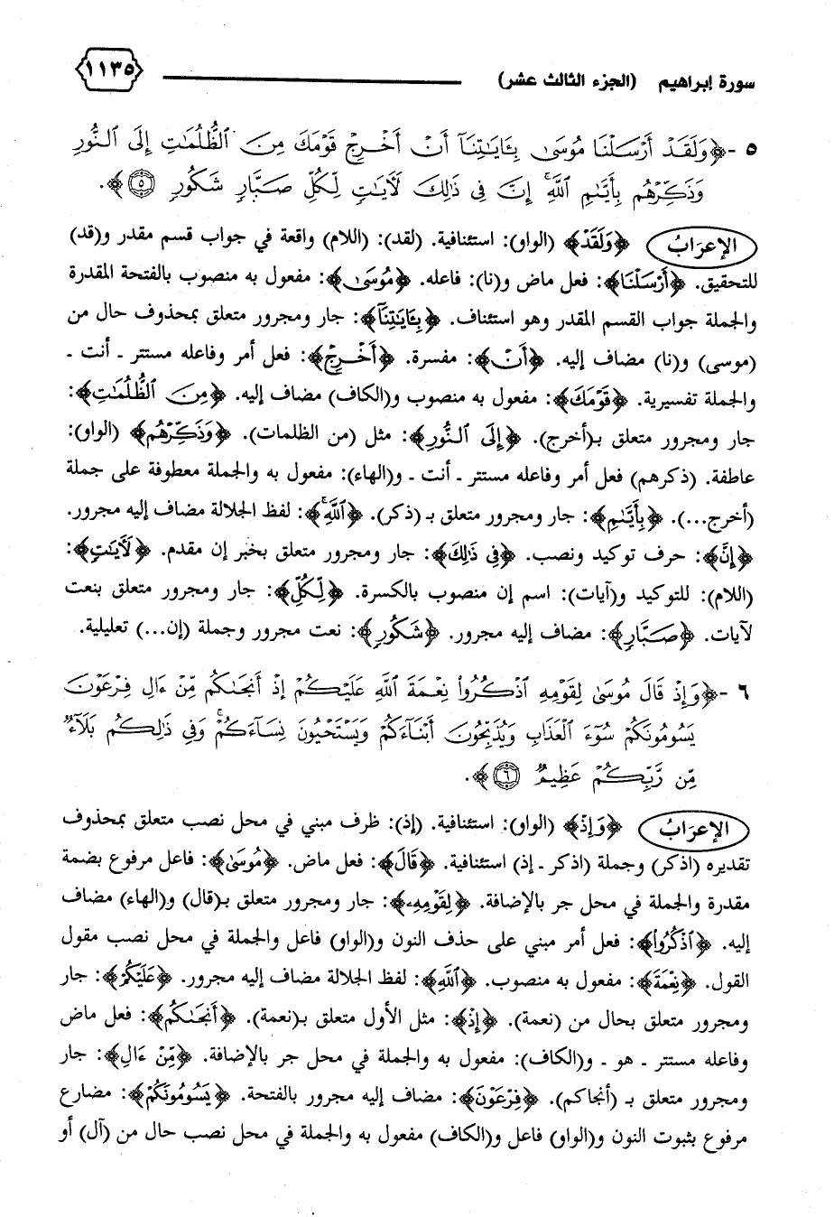الإعراب {وَلَقَدْ} (الواو): استئنافية. (لقد): (اللام) واقعة في جواب قسم مقدر و (قد) للتحقيق. {أَرْسَلْنا}: فعل ماض و (نا): فاعله. {مُوسى}: مفعول به منصوب بالفتحة المقدرة والجملة جواب القسم المقدر وهو استئناف. {بِآياتِنا}: جار ومجرور متعلق بمحذوف حال من (موسى) و (نا) مضاف إليه. {أَنْ}: مفسرة. {أَخْرِجْ}: فعل أمر وفاعله مستتر-أنت- والجملة تفسيرية. {قَوْمَكَ}: مفعول به منصوب و (الكاف) مضاف إليه. {مِنَ الظُّلُماتِ}: