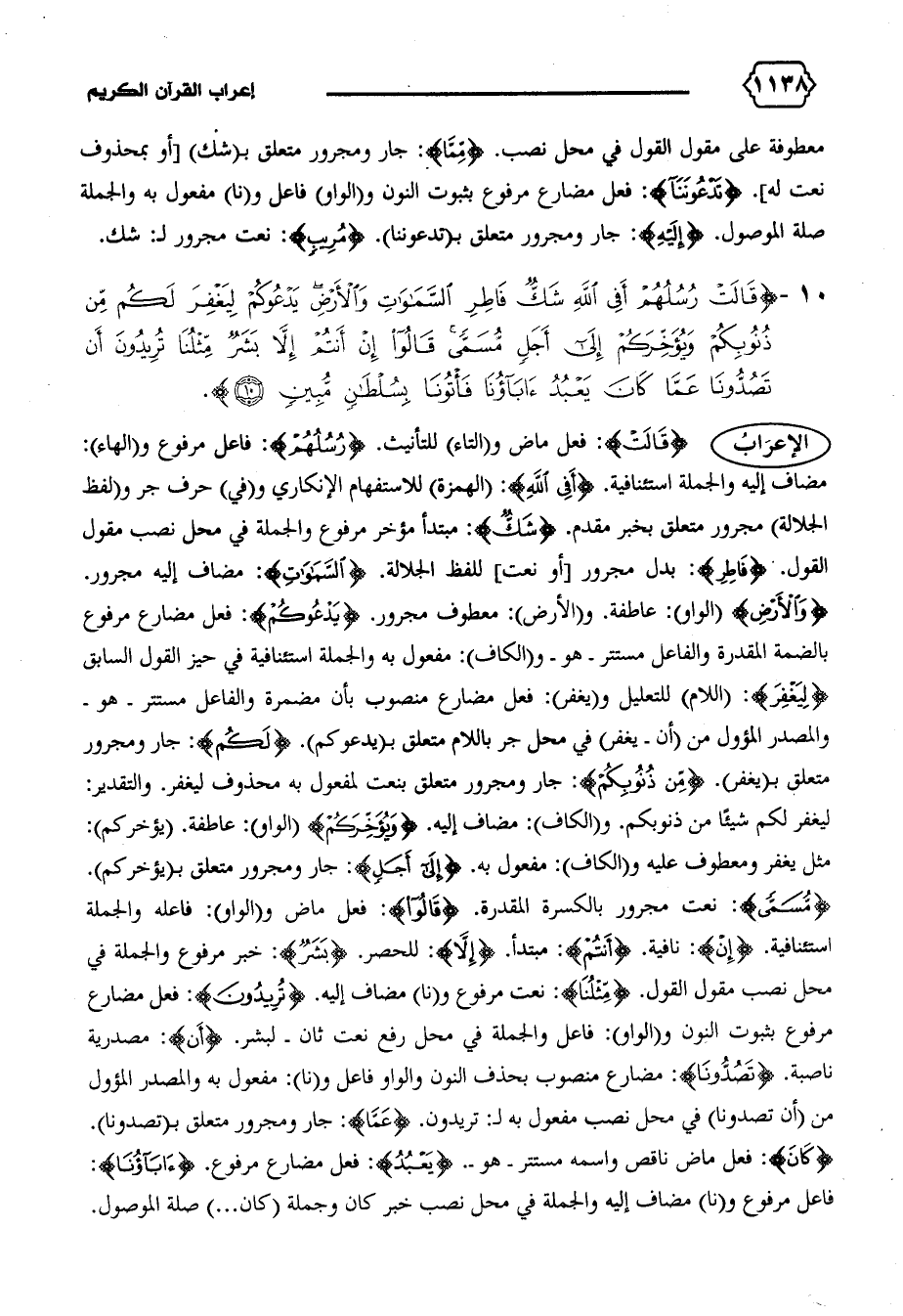 {مُسَمًّى}: نعت مجرور بالكسرة المقدرة. {قالُوا}: فعل ماض و (الواو): فاعله والجملة استئنافية. {إِنْ}: نافية. {أَنْتُمْ}: مبتدأ. {إِلاّ}: للحصر. {بَشَرٌ}: خبر مرفوع والجملة في محل نصب مقول القول. {مِثْلُنا}: نعت مرفوع و (نا) مضاف إليه. {تُرِيدُونَ}: فعل مضارع مرفوع بثبوت النون و (الواو): فاعل والجملة في محل رفع نعت ثان-لبشر. {إِنْ}: مصدرية ناصبة. {تَصُدُّونا}: مضارع منصوب بحذف النون والواو فاعل و (نا): مفعول به والمصدر المؤول من (أن تصدونا) في محل نصب مفعول به ل: تريدون. {عَمّا}: جار ومجرور متعلق ب (تصدونا).