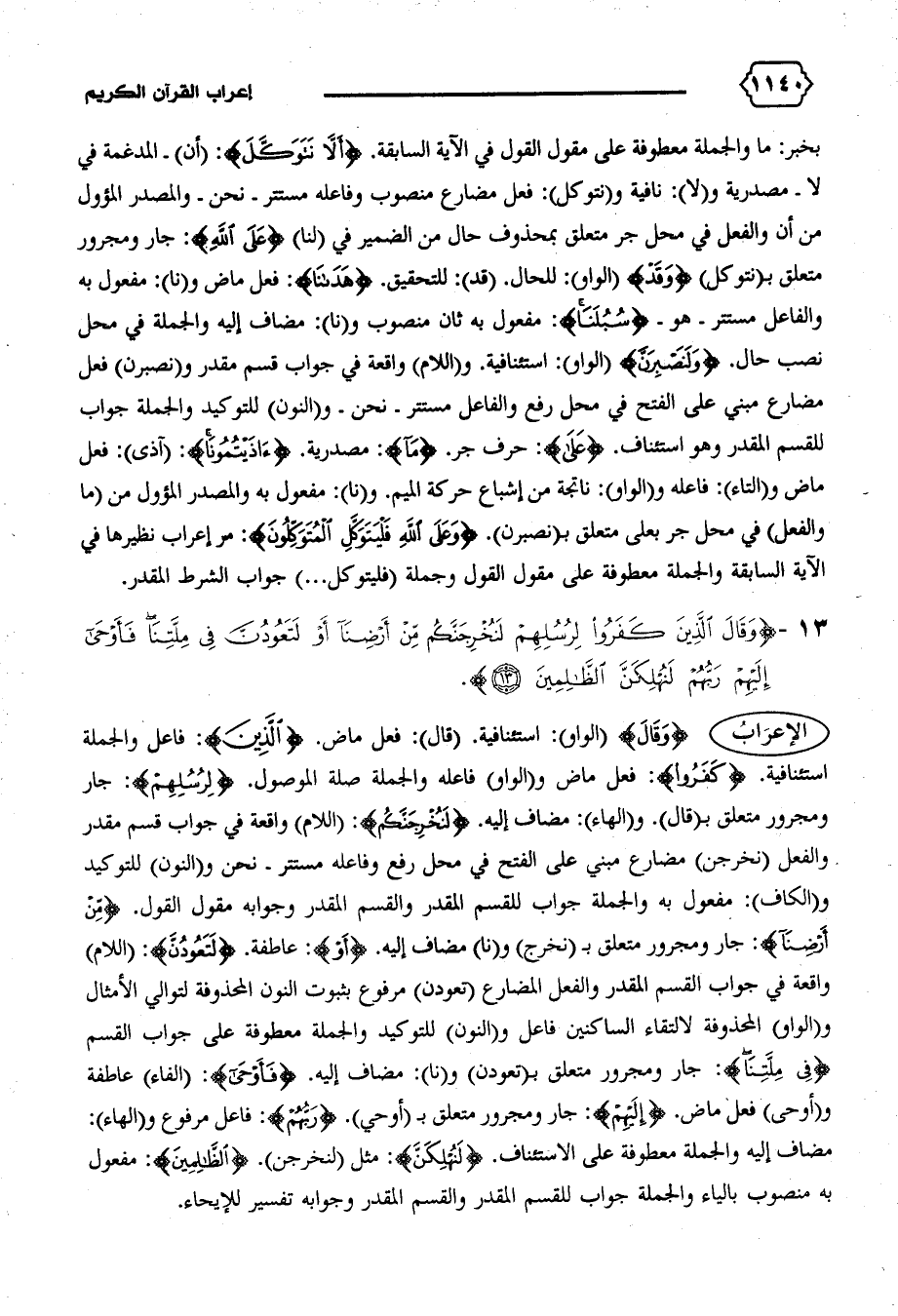 الإعراب {وَقالَ} (الواو): استئنافية. (قال): فعل ماض. {الَّذِينَ}: فاعل والجملة استئنافية. {كَفَرُوا}: فعل ماض و (الواو) فاعله والجملة صلة الموصول. {لِرُسُلِهِمْ}: جار ومجرور متعلق ب (قال).و (الهاء): مضاف إليه. {لَنُخْرِجَنَّكُمْ}: (اللام) واقعة في جواب قسم مقدر والفعل (نخرجن) مضارع مبني على الفتح في محل رفع وفاعله مستتر-نحن و (النون) للتوكيد و (الكاف): مفعول به والجملة جواب للقسم المقدر والقسم المقدر وجوابه مقول القول. {مِنْ أَرْضِنا}: جار ومجرور متعلق ب (نخرج) و (نا) مضاف إليه. {أَوْ}: عاطفة. {لَتَعُودُنَّ}: (اللام) واقعة في جواب القسم المقدر والفعل المضارع (تعودن) مرفوع بثبوت النون المحذوفة لتوالي الأمثال و (الواو) المحذوفة لالتقاء الساكنين فاعل و (النون) للتوكيد والجملة معطوفة على جواب القسم {فِي مِلَّتِنا}: جار ومجرور متعلق ب (تعودن) و (نا): مضاف إليه. {فَأَوْحى}: (الفاء) عاطفة و (أوحى) فعل ماض. {إِلَيْهِمْ}: جار ومجرور متعلق ب (أوحي). {رَبُّهُمْ}: فاعل مرفوع و (الهاء):