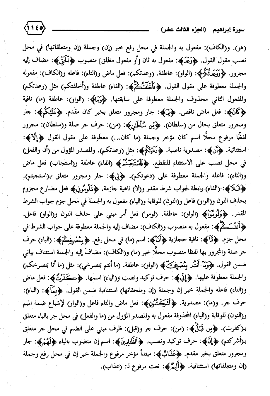 (هو).و (الكاف): مفعول به والجملة في محل رفع خبر (إن) وجملة (إن ومتعلقاتها) في محل نصب مقول القول. {وَعْدَ}: مفعول به ثان [أو مفعول مطلق] منصوب {الْحَقِّ}: مضاف إليه مجرور. {وَوَعَدْتُكُمْ}: (الواو): عاطفة. (وعدتكم): فعل ماض و (التاء): فاعله و (الكاف): مفعوله والجملة معطوفة على مقول القول. {فَأَخْلَفْتُكُمْ}: (الفاء) عاطفة و (أخلفتكم) مثل (وعدتكم) والمفعول الثاني محذوف والجملة معطوفة على سابقتها. {وَما}: (الواو): عاطفة (ما) نافية {كانَ}: فعل ماض ناقص. {لِي}: جار ومجرور متعلق بخبر كان مقدم. {عَلَيْكُمْ}: جار ومجرور متعلق بحال من (سلطان). {مِنْ سُلْطانٍ}: (من): حرف جر صلة و (سلطان): مجرور لفظا مرفوع محلاّ اسم كان مؤخر وجملة (ما كان ... ) معطوفة على مقول القول {إِلاّ}: