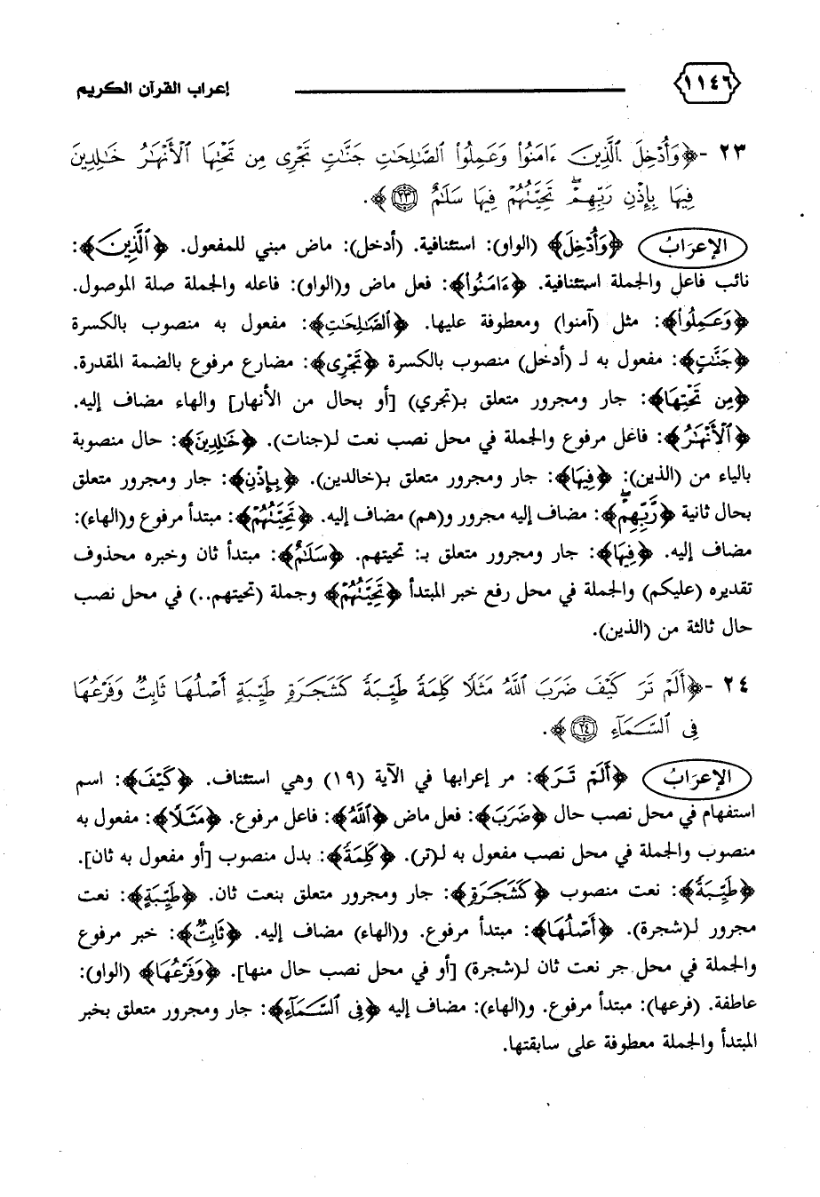 {طَيِّبَةً}: نعت منصوب {كَشَجَرَةٍ}: جار ومجرور متعلق بنعت ثان. {طَيِّبَةً}: نعت مجرور ل (شجرة). {أَصْلُها}: مبتدأ مرفوع. و (الهاء) مضاف إليه. {ثابِتٌ}: خبر مرفوع والجملة في محل جر نعت ثان ل (شجرة) [أو في محل نصب حال منها]. {وَفَرْعُها} (الواو):