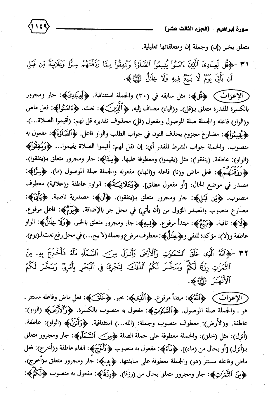 الإعراب {قُلْ}: مثل سابقه في (٣٠) والجملة استئنافية. {لِعِبادِيَ}: جار ومجرور بالكسرة المقدرة متعلق ب (قل).و (الياء) مضاف إليه. {الَّذِينَ}: نعت. {آمَنُوا}: فعل ماض و (الواو) فاعله والجملة صلة الموصول ومفعول (قل) محذوف تقديره قل لهم: (أقيموا الصلاة ... ).
