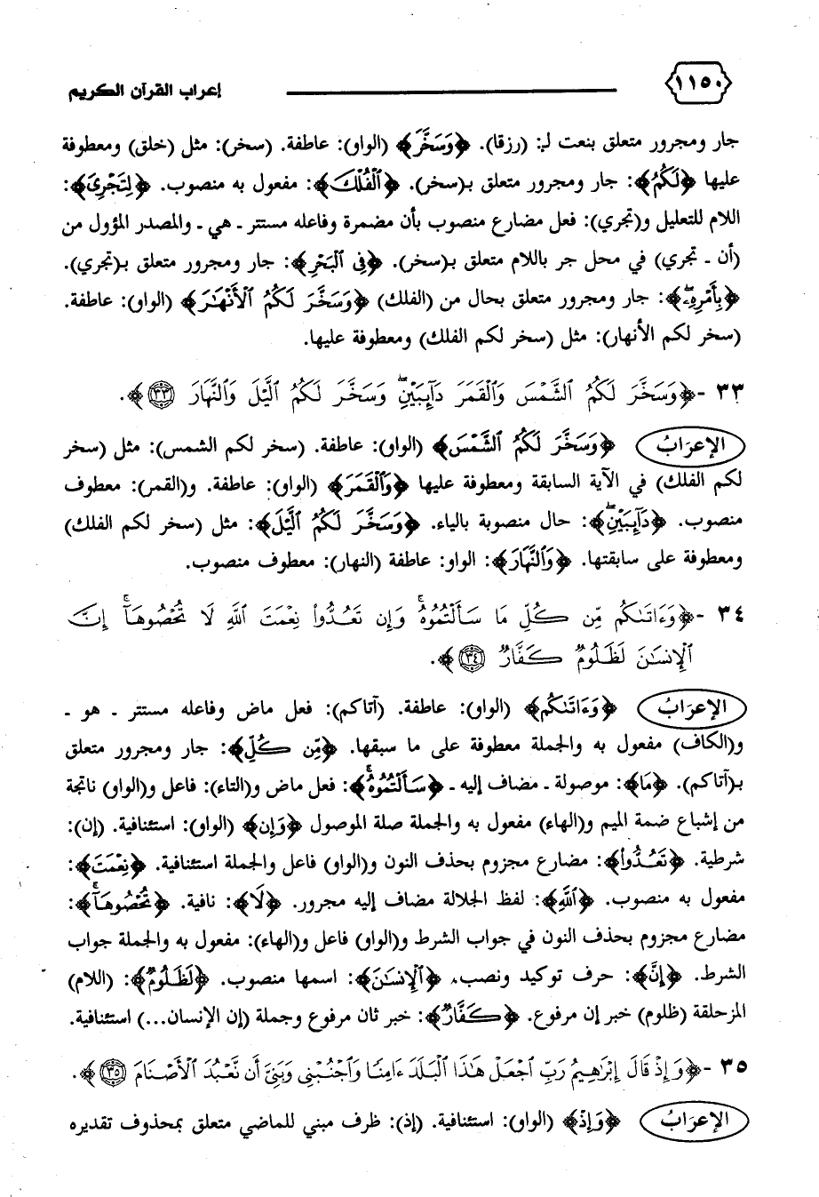 الإعراب {وَسَخَّرَ لَكُمُ الشَّمْسَ} (الواو): عاطفة. (سخر لكم الشمس): مثل (سخر لكم الفلك) في الآية السابقة ومعطوفة عليها {وَالْقَمَرَ} (الواو): عاطفة. و (القمر): معطوف منصوب. {دائِبَيْنِ}: حال منصوبة بالياء. {وَسَخَّرَ لَكُمُ اللَّيْلَ}: مثل (سخر لكم الفلك) ومعطوفة على سابقتها. {وَالنَّهارَ}: الواو: عاطفة (النهار): معطوف منصوب.