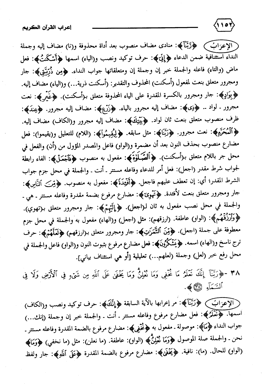 الإعراب {رَبَّنا}: منادى مضاف منصوب بعد أداة محذوفة و (نا) مضاف إليه وجملة النداء استئنافية ضمن الدعاء {إِنِّي}: حرف توكيد ونصب و (الياء) اسمها {أَسْكَنْتُ}: فعل ماض (والتاء) فاعله والجملة خبر إن وجملة إن ومتعلقاتها جواب النداء. {مِنْ ذُرِّيَّتِي}: جار ومجرور متعلق بنعت لمفعول (أسكنت) المحذوف والتقدير: (أسكنت ذرية ... ) و (الياء) مضاف إليه.