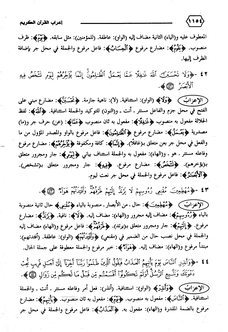 الإعراب {وَلا} (الواو): استئنافية. (لا): ناهية جازمة. {تَحْسَبَنَّ}: مضارع مبني على الفتح في محل جزم والفاعل مستتر-أنت-و (النون) للتوكيد والجملة استئنافية. {اللهَ}: لفظ الجلالة مفعول به منصوب {غافِلاً}: مفعول به ثان منصوب {عَمّا}: (عن) حرف جر و (ما) مصدرية {يَعْمَلُ}: مضارع مرفوع {الظّالِمُونَ}: فاعل مرفوع بالواو والمصدر المؤول من ما والفعل في محل جر بعن متعلق ب (غافلا). {إِنَّما}: كافة ومكفوفة {يُؤَخِّرُهُمْ}: مضارع مرفوع وفاعله مستتر-هو-و (الهاء): مفعول به والجملة استئناف بياني {لِيَوْمٍ}: جار ومجرور متعلق ب (يؤخرهم). {تَشْخَصُ}: مضارع مرفوع. {فِيهِ}: جار ومجرور متعلق ب (تشخص).
