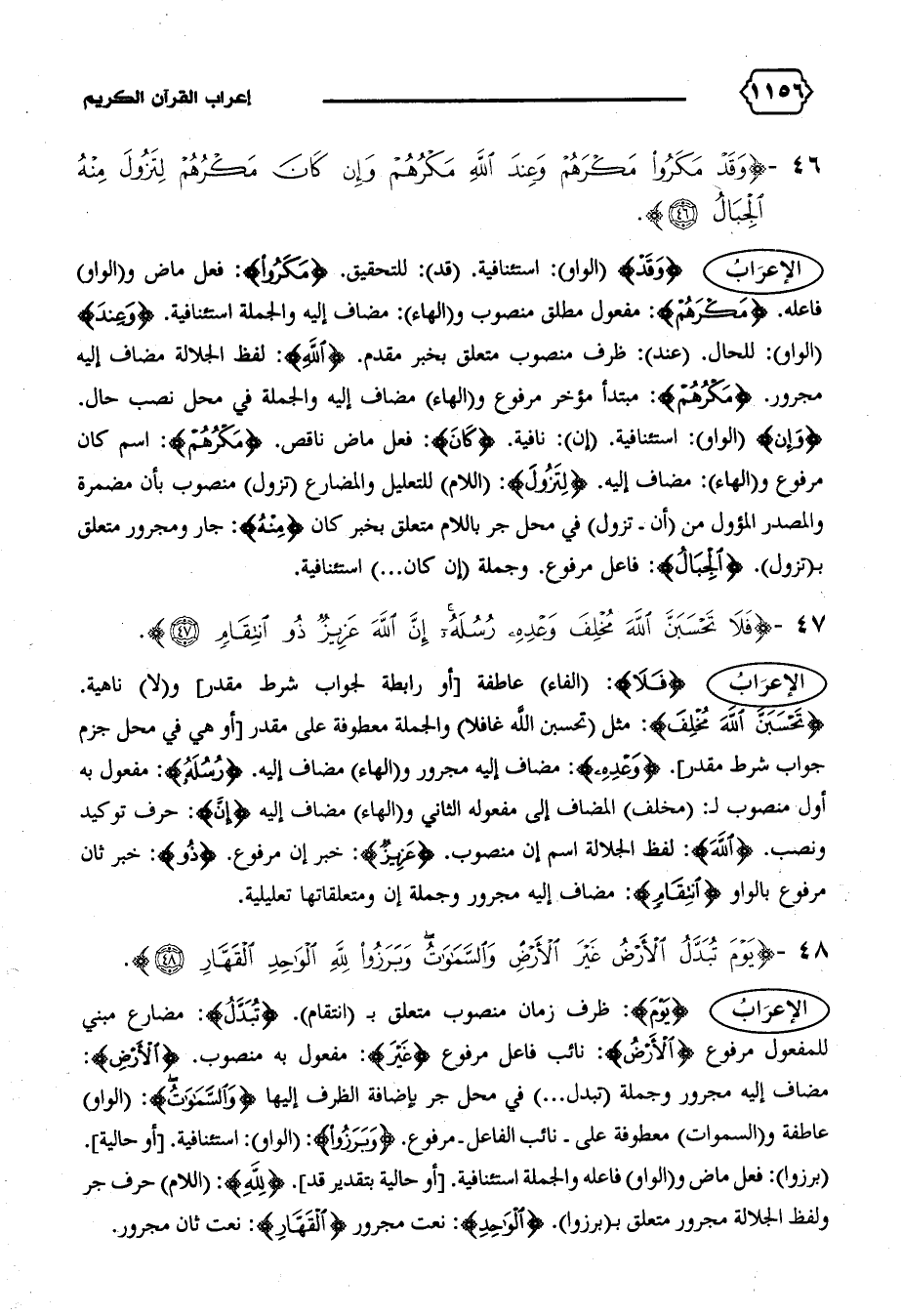 الإعراب {وَقَدْ} (الواو): استئنافية. (قد): للتحقيق. {مَكَرُوا}: فعل ماض و (الواو) فاعله. {مَكْرَهُمْ}: مفعول مطلق منصوب و (الهاء): مضاف إليه والجملة استئنافية. {وَعِنْدَ} (الواو): للحال. (عند): ظرف منصوب متعلق بخبر مقدم. {اللهِ}: لفظ الجلالة مضاف إليه مجرور. {مَكْرَهُمْ}: مبتدأ مؤخر مرفوع و (الهاء) مضاف إليه والجملة في محل نصب حال.
