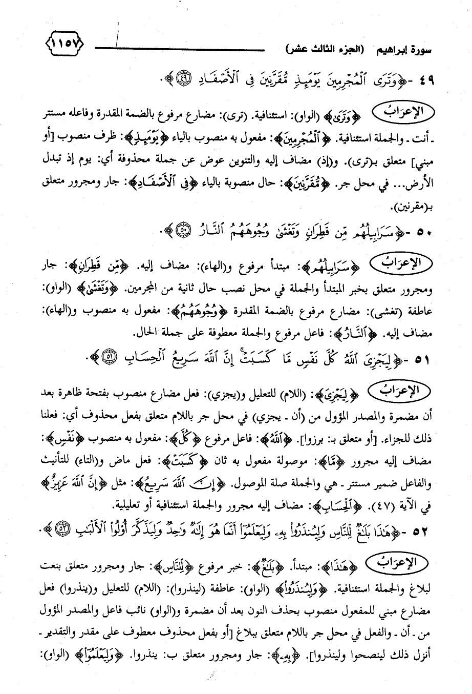 الإعراب {وَتَرَى} (الواو): استئنافية. (ترى): مضارع مرفوع بالضمة المقدرة وفاعله مستتر -أنت-والجملة استئنافية. {الْمُجْرِمِينَ}: مفعول به منصوب بالياء {يَوْمَئِذٍ}: ظرف منصوب [أو مبني] متعلق ب (ترى).و (إذ) مضاف إليه والتنوين عوض عن جملة محذوفة أي: يوم إذ تبدل الأرض ... في محل جر. {مُقَرَّنِينَ}: حال منصوبة بالياء {فِي الْأَصْفادِ}: جار ومجرور متعلق ب (مقرنين).