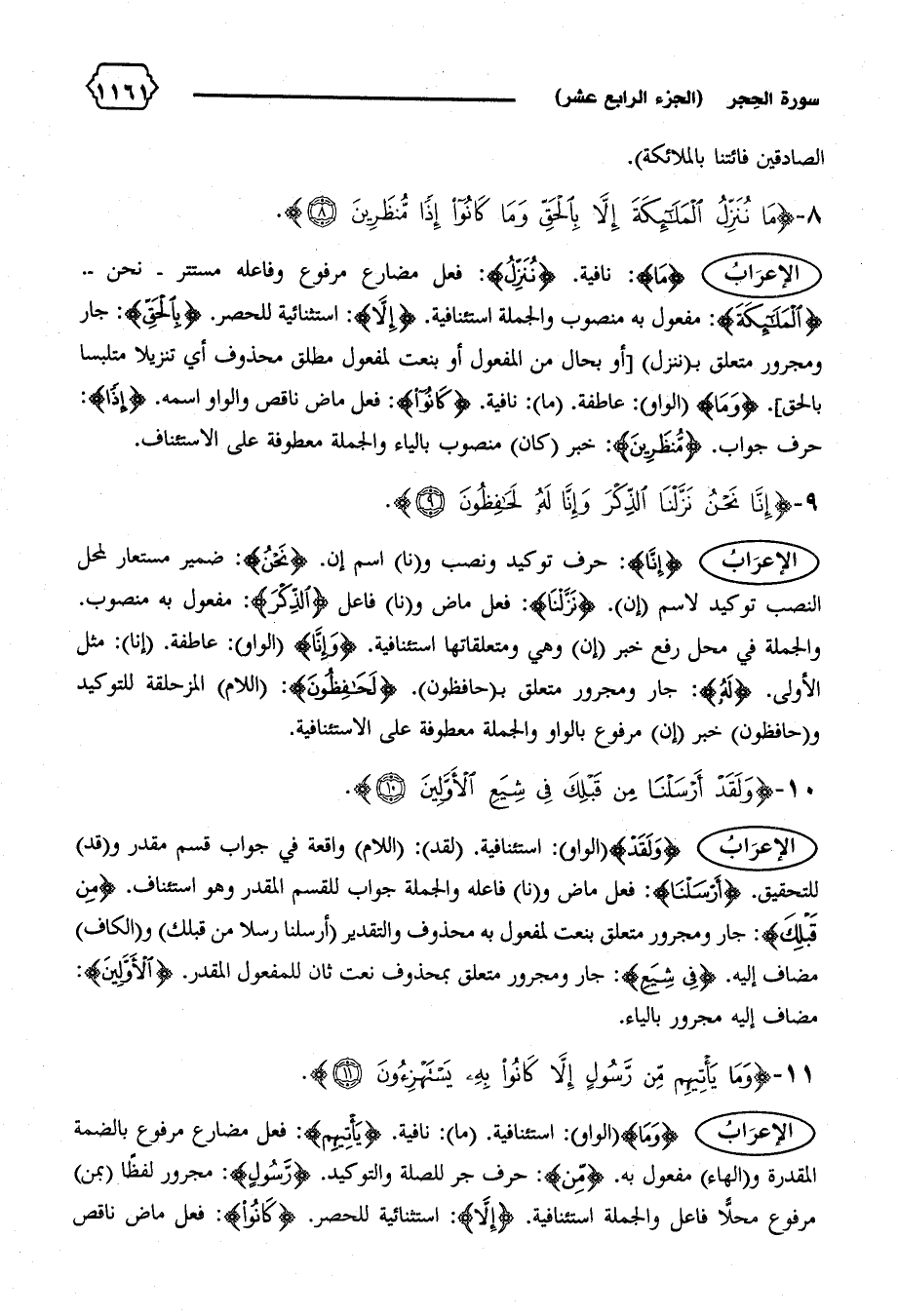 {الْمَلائِكَةَ}: مفعول به منصوب والجملة استئنافية. {إِلاّ}: استثنائية للحصر. {بِالْحَقِّ}: جار ومجرور متعلق ب (ننزل) [أو بحال من المفعول أو بنعت لمفعول مطلق محذوف أي تنزيلا متلبسا بالحق]. {وَما} (الواو): عاطفة. (ما): نافية. {كانُوا}: فعل ماض ناقص والواو اسمه. {إِذاً}: