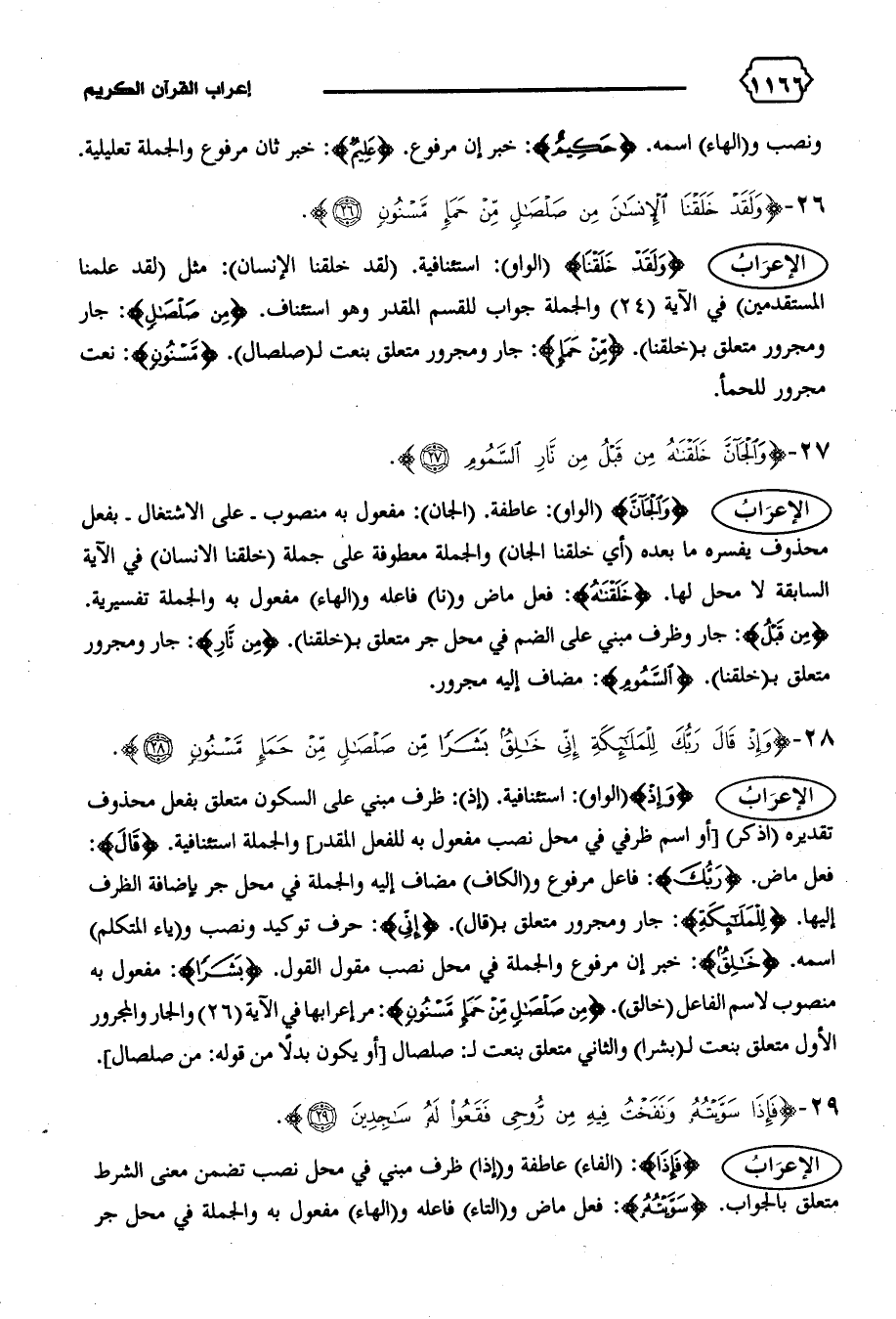 فعل ماض. {رَبُّكَ}: فاعل مرفوع و (الكاف) مضاف إليه والجملة في محل جر بإضافة الظرف إليها. {لِلْمَلائِكَةِ}: جار ومجرور متعلق ب (قال). {إِنِّي}: حرف توكيد ونصب و (ياء المتكلم) اسمه. {خالِقٌ}: خبر إن مرفوع والجملة في محل نصب مقول القول. {بَشَراً}: مفعول به منصوب لاسم الفاعل (خالق). {مِنْ صَلْصالٍ مِنْ حَمَإٍ مَسْنُونٍ}: مر إعرابها في الآية (٢٦) والجار والمجرور الأول متعلق بنعت ل (بشرا) والثاني متعلق بنعت ل: صلصال [أو يكون بدلا من قوله: من صلصال].