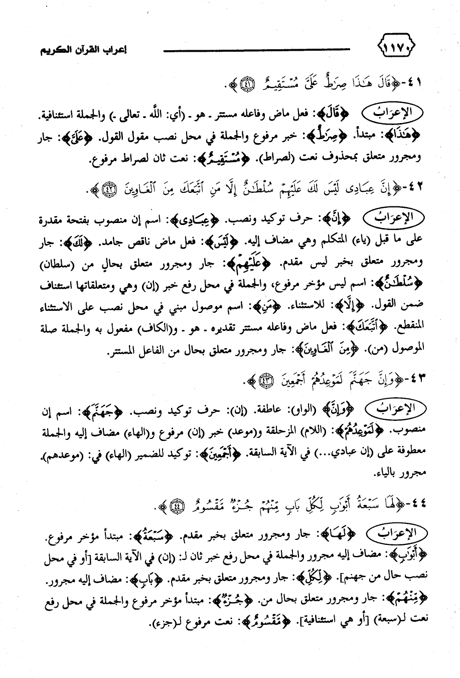 الإعراب {إِنَّ}: حرف توكيد ونصب. {عِبادِي}: اسم إن منصوب بفتحة مقدرة على ما قبل (ياء) المتكلم وهي مضاف إليه. {لَيْسَ}: فعل ماض ناقص جامد. {لَكَ}: جار ومجرور متعلق بخبر ليس مقدم. {عَلَيْهِمْ}: جار ومجرور متعلق بحال من (سلطان) {سُلْطانٌ}: اسم ليس مؤخر مرفوع، والجملة في محل رفع خبر (إن) وهي ومتعلقاتها استئناف ضمن القول. {إِلاّ}: للاستثناء. {مَنِ}: اسم موصول مبني في محل نصب على الاستثناء المنقطع. {اِتَّبَعَكَ}: فعل ماض وفاعله مستتر تقديره-هو-و (الكاف) مفعول به والجملة صلة الموصول (من). {مِنَ الْغاوِينَ}: جار ومجرور متعلق بحال من الفاعل المستتر.