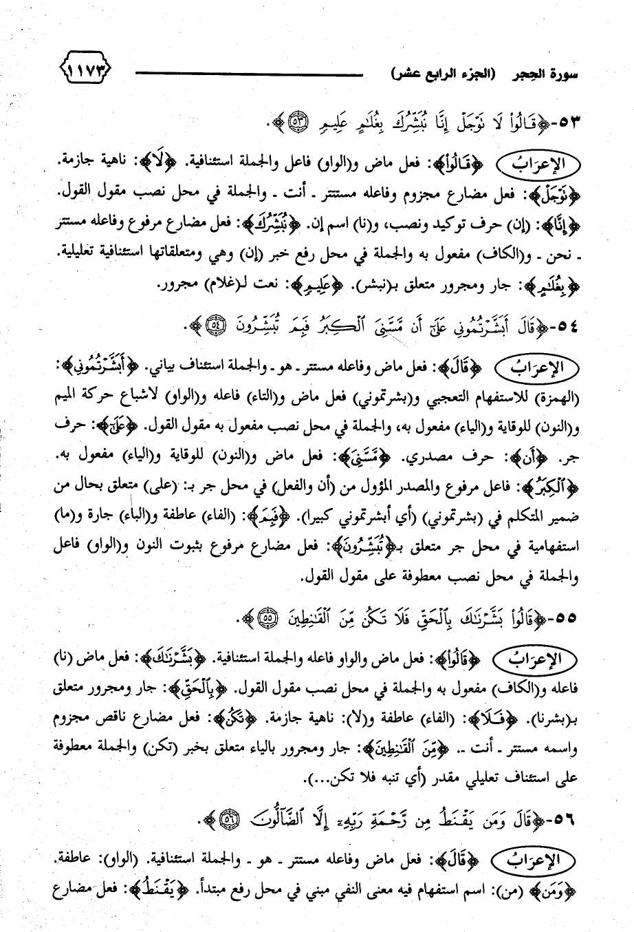 الإعراب {قالُوا}: فعل ماض والواو فاعله والجملة استئنافية. {بَشَّرْناكَ}: فعل ماض (نا) فاعله و (الكاف) مفعول به والجملة في محل نصب مقول القول. {بِالْحَقِّ}: جار ومجرور متعلق ب (بشرنا). {فَلا}: (الفاء) عاطفة و (لا): ناهية جازمة. {تَكُنْ}: فعل مضارع ناقص مجزوم واسمه مستتر-أنت-. {مِنَ الْقانِطِينَ}: جار ومجرور بالياء متعلق بخبر (تكن) والجملة معطوفة على استئناف تعليلي مقدر (أي تنبه فلا تكن ... ).