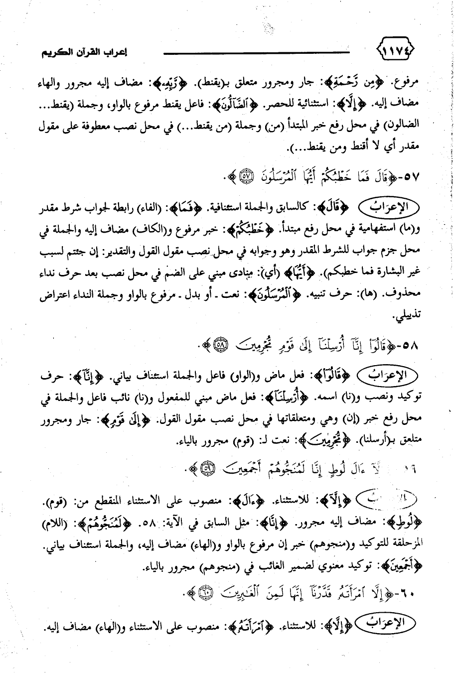 الإعراب {قالُوا}: فعل ماض و (الواو) فاعل والجملة استئناف بياني. {إِنّا}: حرف توكيد ونصب و (نا) اسمه. {أُرْسِلْنا}: فعل ماض مبني للمفعول و (نا) نائب فاعل والجملة في محل رفع خبر (إن) وهي ومتعلقاتها في محل نصب مقول القول. {إِلى قَوْمٍ}: جار ومجرور متعلق ب (أرسلنا). {مُجْرِمِينَ}: نعت ل: (قوم) مجرور بالياء.