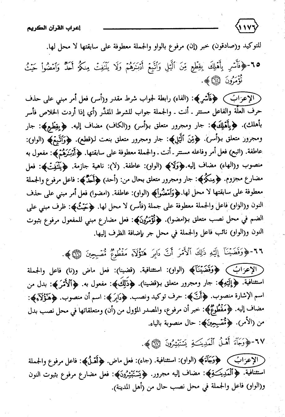 عاطفة. (اتبع) فعل أمر وفاعله مستتر-أنت-والجملة معطوفة على سابقتها. {أَدْبارَهُمْ}: مفعول به منصوب و (الهاء) مضاف إليه. {وَلا} (الواو): عاطفة. (لا): ناهية جازمة. {يَلْتَفِتْ}: فعل مضارع مجزوم. {مِنْكُمْ}: جار ومجرور متعلق بحال من: (أحد) {أَحَدٌ}: فاعل مرفوع والجملة معطوفة على سابقتها لا محل لها. {وَامْضُوا} (الواو): عاطفة. (امضوا) فعل أمر مبني على حذف النون و (الواو) فاعل والجملة معطوفة على جملة (فأسر) لا محل لها. {حَيْثُ}: ظرف مبني على الضم في محل نصب متعلق ب (امضوا). {تُؤْمَرُونَ}: فعل مضارع مبني للمفعول مرفوع بثبوت النون و (الواو) نائب فاعل والجملة في محل جر بإضافة الظرف إليها.