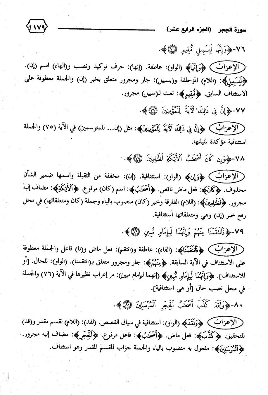 الإعراب {فَانْتَقَمْنا}: (الفاء): عاطفة و (انتقم): فعل ماض و (نا) فاعل والجملة معطوفة على الاستئناف في الآية السابقة. {مِنْهُمْ}: جار ومجرور متعلق ب (انتقمنا). (الواو): للحال. [أو للاستئناف]. {وَإِنَّهُما لَبِإِمامٍ مُبِينٍ} (إنهما لبإمام مبين): مر إعراب نظيرها في الآية (٧٦) والجملة في محل نصب حال [أو هي استئنافية].