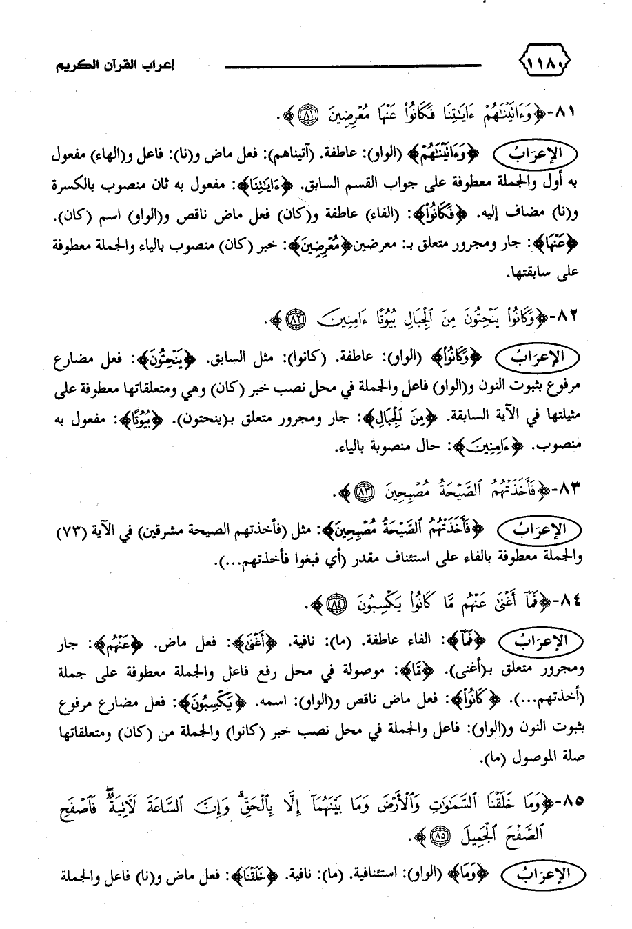 الإعراب {وَكانُوا} (الواو): عاطفة. (كانوا): مثل السابق. {يَنْحِتُونَ}: فعل مضارع مرفوع بثبوت النون و (الواو) فاعل والجملة في محل نصب خبر (كان) وهي ومتعلقاتها معطوفة على مثيلتها في الآية السابقة. {مِنَ الْجِبالِ}: جار ومجرور متعلق ب (ينحتون). {بُيُوتاً}: مفعول به منصوب. {آمِنِينَ}: حال منصوبة بالياء.
