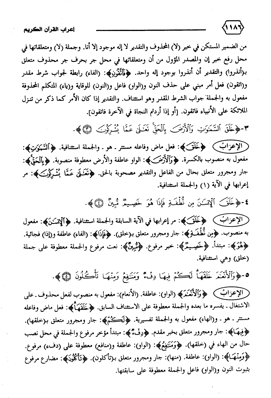 الإعراب {وَالْأَنْعامَ} (الواو): عاطفة. (الأنعام): مفعول به منصوب لفعل محذوف-على الاشتغال-يفسره ما بعده والجملة معطوفة على الاستئناف السابق. {خَلَقَها}: فعل ماض وفاعله مستتر-هو-و (الهاء) مفعول به والجملة تفسيرية. {لَكُمْ}: جار ومجرور متعلق ب (خلقها).