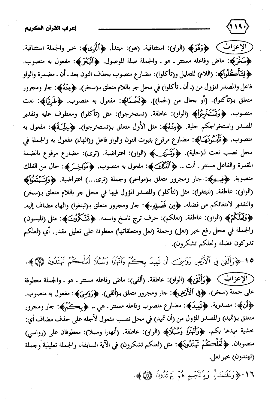{لِتَأْكُلُوا}: (اللام) للتعليل و (تأكلوا): مضارع منصوب بحذف النون بعد-أن-مضمرة والواو فاعل والمصدر المؤول من (-أن-تأكلوا) في محل جر باللام متعلق ب (سخر). {مِنْهُ}: جار ومجرور متعلق ب (تأكلوا). [أو بحال من (لحما)]. {لَحْماً}: مفعول به منصوب. {طَرِيًّا}: نعت منصوب. {وَتَسْتَخْرِجُوا} (الواو): عاطفة. (تستخرجوا): مثل (تأكلوا) ومعطوف عليه وتقدير المصدر واستخراجكم حلية. {مِنْهُ}: مثل الأول متعلق ب (تستخرجوا). {حِلْيَةً}: مفعول به منصوب. {تَلْبَسُونَها}: مضارع مرفوع بثبوت النون والواو فاعل و (الهاء) مفعول به والجملة في محل نصب نعت ل (حلية). {وَتَرَى} (الواو): اعتراضية. (ترى): مضارع مرفوع بالضمة المقدرة والفاعل مستتر-أنت-. {الْفُلْكَ}: مفعول به منصوب. {مَواخِرَ}: حال من الفلك منصوبة. {فِيهِ}: جار ومجرور متعلق ب (مواخر) وجملة (ترى ... ) اعتراضية. {وَلِتَبْتَغُوا} (الواو): عاطفة. (لتبتغوا): مثل (لتأكلوا) والمصدر المؤول فيها في محل جر باللام متعلق ب (سخر) والتقدير لابتغائكم من فضله. {مِنْ فَضْلِهِ}: جار ومجرور متعلق ب (تبتغوا) والهاء مضاف إليه.