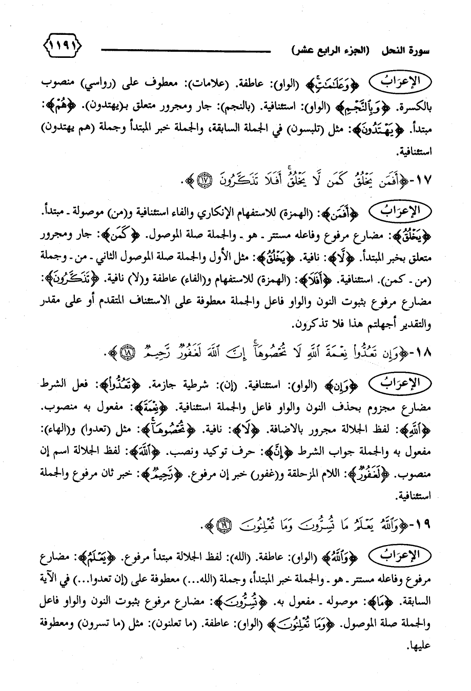 الإعراب {وَعَلاماتٍ} (الواو): عاطفة. (علامات): معطوف على (رواسي) منصوب بالكسرة. {وَبِالنَّجْمِ} (الواو): استئنافية. (بالنجم): جار ومجرور متعلق ب (يهتدون). {هُمْ}: