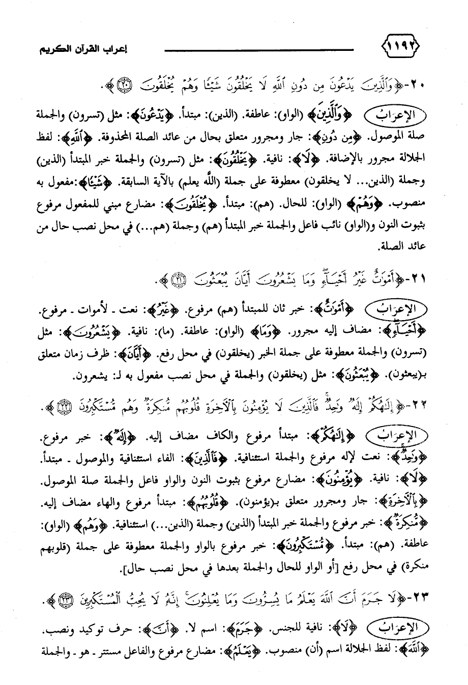 الإعراب {وَالَّذِينَ} (الواو): عاطفة. (الذين): مبتدأ. {يَدْعُونَ}: مثل (تسرون) والجملة صلة الموصول. {مِنْ دُونِ}: جار ومجرور متعلق بحال من عائد الصلة المحذوفة. {اللهِ}: لفظ الجلالة مجرور بالإضافة. {لا}: نافية. {يَخْلُقُونَ}: مثل (تسرون) والجملة خبر المبتدأ (الذين) وجملة (الذين ... لا يخلقون) معطوفة على جملة (الله يعلم) بالآية السابقة. {شَيْئاً}: مفعول به منصوب. {وَهُمْ} (الواو): للحال. (هم): مبتدأ. {يَخْلُقُونَ}: مضارع مبني للمفعول مرفوع بثبوت النون و (الواو) نائب فاعل والجملة خبر المبتدأ (هم) وجملة (هم ... ) في محل نصب حال من عائد الصلة.