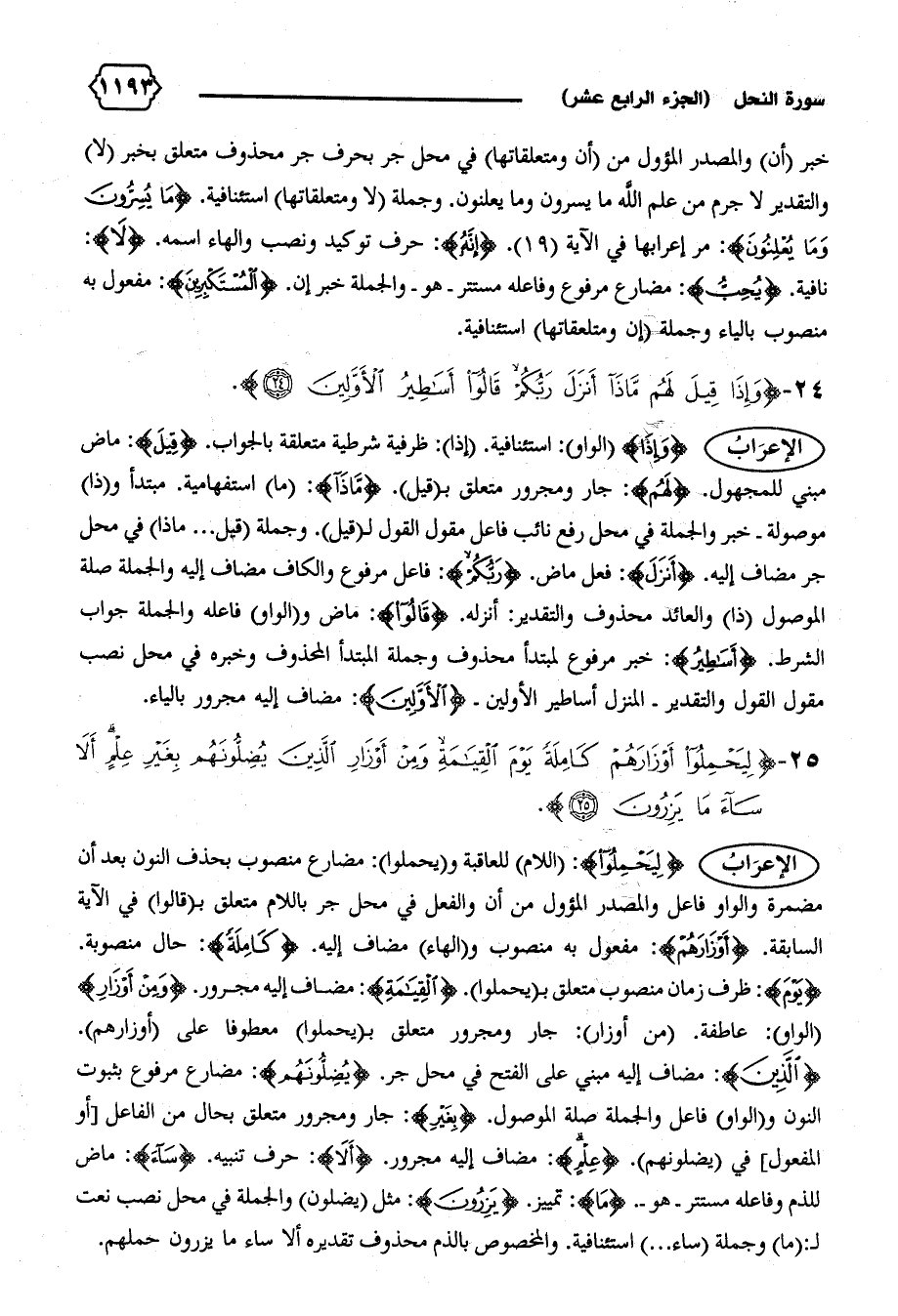 الإعراب {وَإِذا} (الواو): استئنافية. (إذا): ظرفية شرطية متعلقة بالجواب. {قِيلَ}: ماض مبني للمجهول. {لَهُمْ}: جار ومجرور متعلق ب (قيل). {ماذا}: (ما) استفهامية. مبتدأ و (ذا) موصولة-خبر والجملة في محل رفع نائب فاعل مقول القول ل (قيل).وجملة (قيل ... ماذا) في محل جر مضاف إليه. {أَنْزَلَ}: فعل ماض. {رَبُّكُمْ}: فاعل مرفوع والكاف مضاف إليه والجملة صلة الموصول (ذا) والعائد محذوف والتقدير: أنزله. {قالُوا}: ماض و (الواو) فاعله والجملة جواب الشرط. {أَساطِيرُ}: خبر مرفوع لمبتدإ محذوف وجملة المبتدأ المحذوف وخبره في محل نصب مقول القول والتقدير-المنزل أساطير الأولين- {الْأَوَّلِينَ}: مضاف إليه مجرور بالياء.