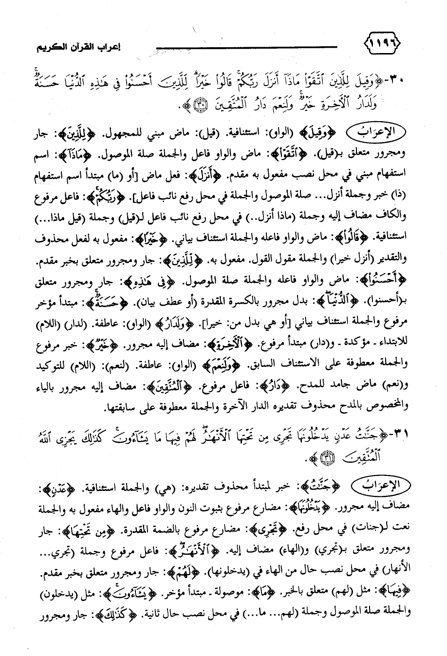 الإعراب {وَقِيلَ} (الواو): استئنافية. (قيل): ماض مبني للمجهول. {لِلَّذِينَ}: جار ومجرور متعلق ب (قيل). {اِتَّقَوْا}: ماض والواو فاعل والجملة صلة الموصول. {ماذا}: اسم استفهام مبني في محل نصب مفعول به مقدم. {أَنْزَلَ}: فعل ماض [أو (ما) مبتدأ اسم استفهام (ذا) خبر وجملة أنزل ... صلة الموصول والجملة في محل رفع نائب فاعل]. {رَبُّكُمْ}: فاعل مرفوع والكاف مضاف إليه وجملة (ماذا أنزل ... ) في محل رفع نائب فاعل ل (قيل) وجملة (قيل ماذا ... ) استئنافية. {قالُوا}: ماض والواو فاعله والجملة استئناف بياني. {خَيْراً}: مفعول به لفعل محذوف والتقدير (أنزل خيرا) والجملة مقول القول. مفعول به. {لِلَّذِينَ}: جار ومجرور متعلق بخبر مقدم.