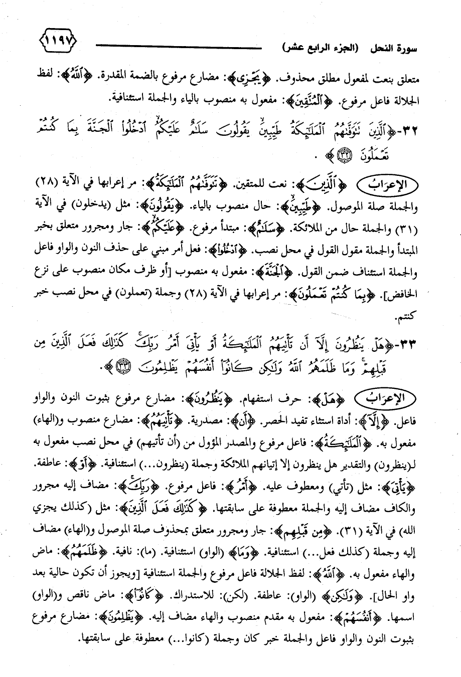 الإعراب {الَّذِينَ}: نعت للمتقين. {تَتَوَفّاهُمُ الْمَلائِكَةُ}: مر إعرابها في الآية (٢٨) والجملة صلة الموصول. {طَيِّبِينَ}: حال منصوب بالياء. {يَقُولُونَ}: مثل (يدخلون) في الآية (٣١) والجملة حال من الملائكة. {سَلامٌ}: مبتدأ مرفوع. {عَلَيْكُمْ}: جار ومجرور متعلق بخبر المبتدأ والجملة مقول القول في محل نصب. {اُدْخُلُوا}: فعل أمر مبني على حذف النون والواو فاعل والجملة استئناف ضمن القول. {الْجَنَّةَ}: مفعول به منصوب [أو ظرف مكان منصوب على نزع الخافض]. {بِما كُنْتُمْ تَعْمَلُونَ}: مر إعرابها في الآية (٢٨) وجملة (تعملون) في محل نصب خبر كنتم.