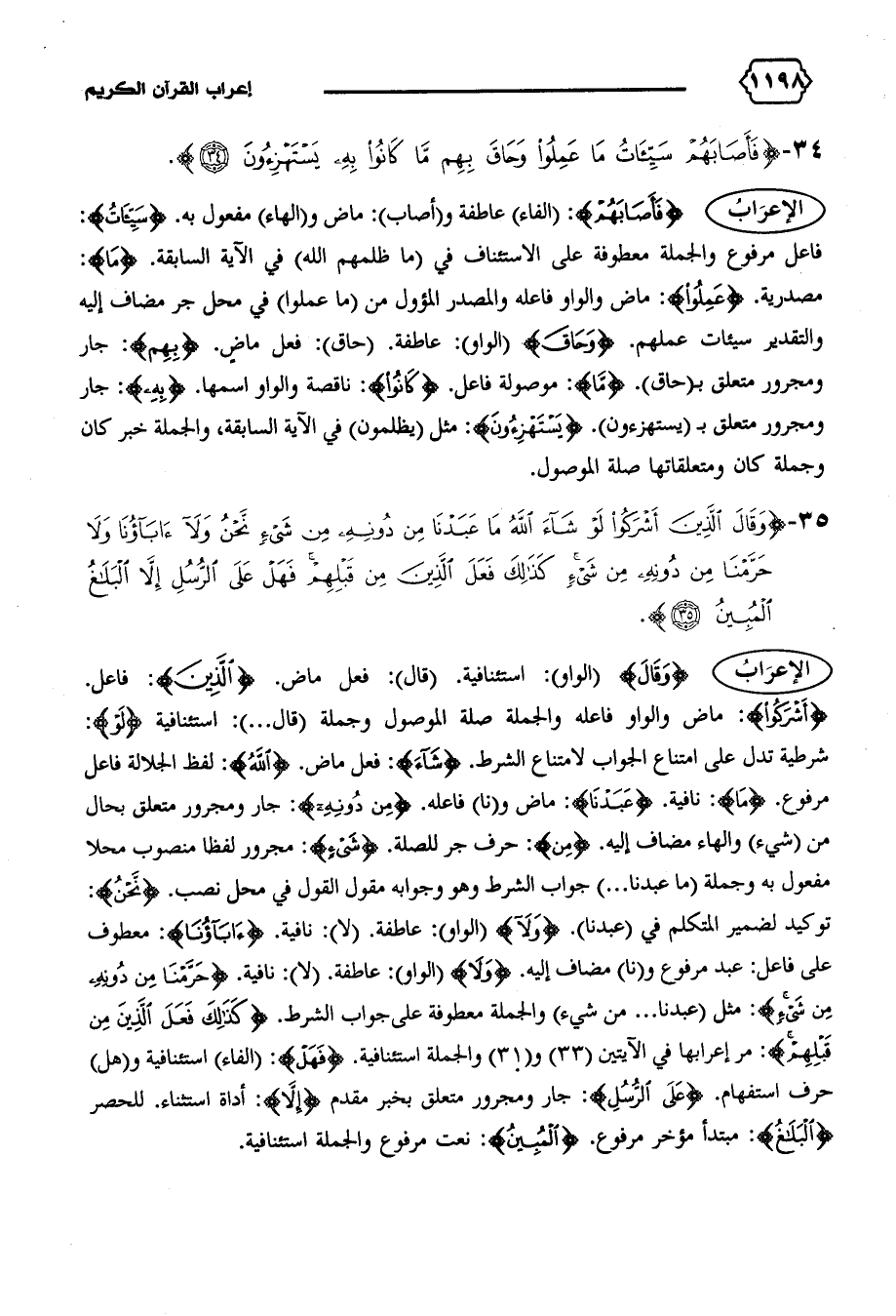 توكيد لضمير المتكلم في (عبدنا). {وَلا}: (الواو): عاطفة. (لا): نافية. {آباؤُنا}: معطوف على فاعل: عبد مرفوع و (نا) مضاف إليه. {وَلا} (الواو): عاطفة. (لا): نافية. {حَرَّمْنا مِنْ دُونِهِ مِنْ شَيْءٍ}: مثل (عبدنا ... من شيء) والجملة معطوفة على جواب الشرط. {كَذلِكَ فَعَلَ الَّذِينَ مِنْ قَبْلِهِمْ}: مر إعرابها في الآيتين (٣٣) و (٣١) والجملة استئنافية. {فَهَلْ}: (الفاء) استئنافية و (هل) حرف استفهام. {عَلَى الرُّسُلِ}: جار ومجرور متعلق بخبر مقدم {إِلَاّ}: أداة استثناء. للحصر {الْبَلاغُ}: مبتدأ مؤخر مرفوع. {الْمُبِينُ}: نعت مرفوع والجملة استئنافية.