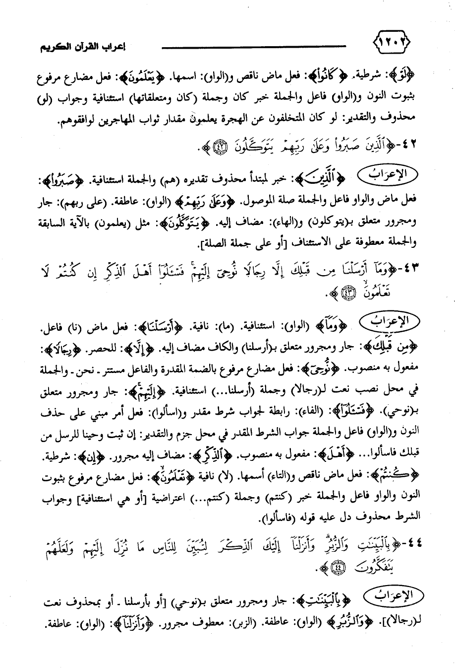 مفعول به منصوب. {نُوحِي}: فعل مضارع مرفوع بالضمة المقدرة والفاعل مستتر-نحن-والجملة في محل نصب نعت ل (رجالا) وجملة (أرسلنا ... ) استئنافية. {إِلَيْهِمْ}: جار ومجرور متعلق ب (نوحي). {فَسْئَلُوا}: (الفاء): رابطة لجواب شرط مقدر و (اسألوا): فعل أمر مبني على حذف النون و (الواو) فاعل والجملة جواب الشرط المقدر في محل جزم والتقدير: إن ثبت وحينا للرسل من قبلك فاسألوا ... {أَهْلَ}: مفعول به منصوب. {الذِّكْرِ}: مضاف إليه مجرور. {إِنْ}: شرطية.