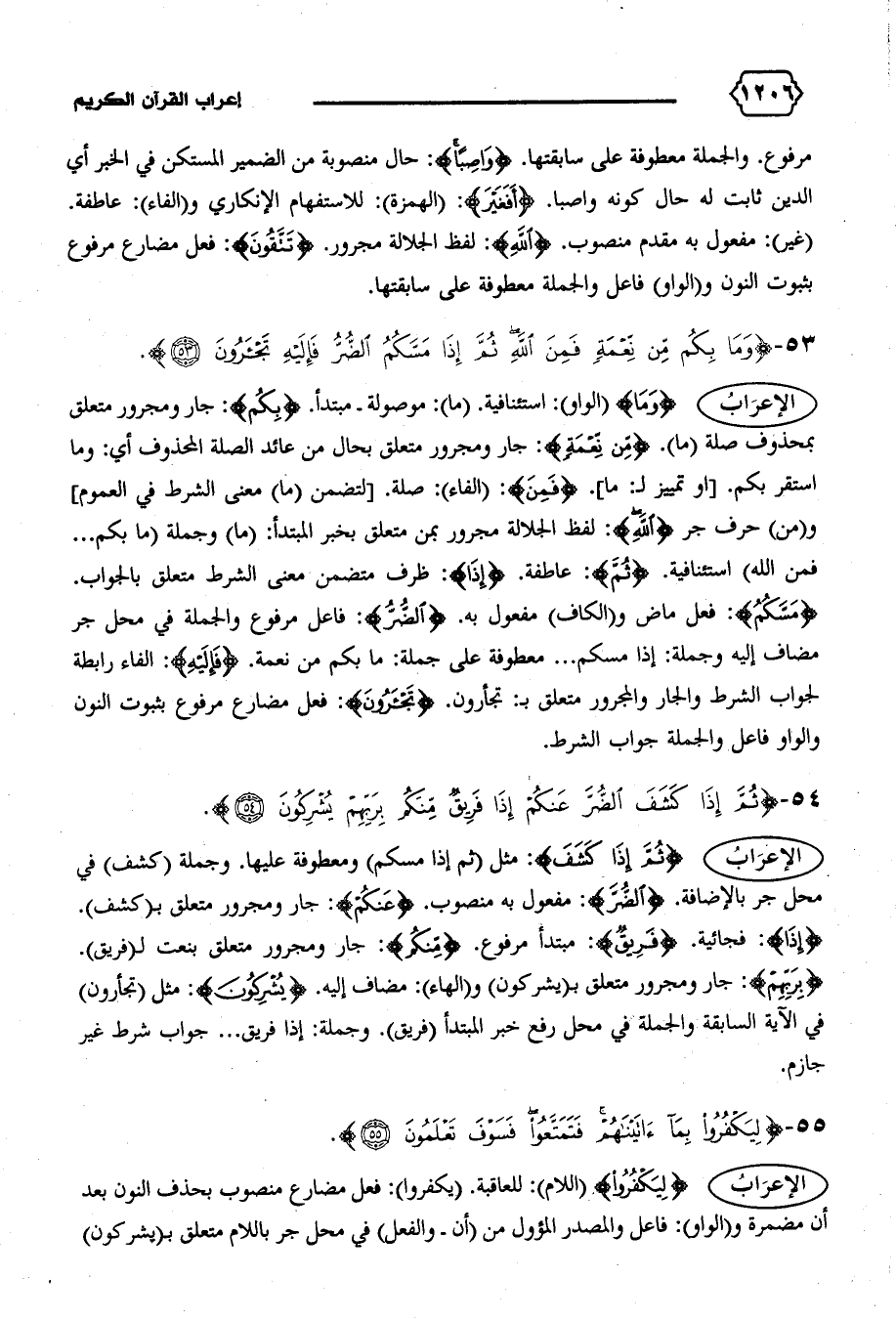 {مَسَّكُمُ}: فعل ماض و (الكاف) مفعول به. {الضُّرُّ}: فاعل مرفوع والجملة في محل جر مضاف إليه وجملة: إذا مسكم ... معطوفة على جملة: ما بكم من نعمة. {فَإِلَيْهِ}: الفاء رابطة لجواب الشرط والجار والمجرور متعلق ب: تجأرون. {تَجْئَرُونَ}: فعل مضارع مرفوع بثبوت النون والواو فاعل والجملة جواب الشرط.