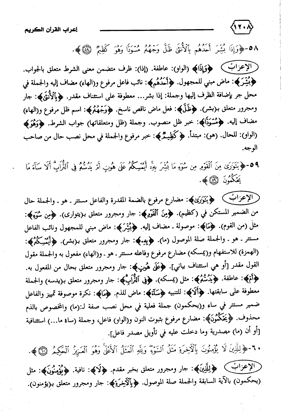 {بُشِّرَ}: ماض مبني للمجهول. {أَحَدُهُمْ}: نائب فاعل مرفوع و (الهاء) مضاف إليه والجملة في محل جر بإضافة الظرف إليها وجملة: إذا بشر ... معطوفة على استئناف مقدر. {بِالْأُنْثى}: جار ومجرور متعلق ب (بشر). {ظَلَّ}: فعل ماض ناقص ناسخ. {وَجْهُهُ}: اسم ظل مرفوع و (الهاء) مضاف إليه. {مُسْوَدًّا}: خبر ظل منصوب. وجملة (ظل ومتعلقاتها) جواب الشرط. {وَهُوَ} (الواو): للحال. (هو): مبتدأ. {كَظِيمٌ}: خبر مرفوع والجملة في محل نصب حال من صاحب الوجه.