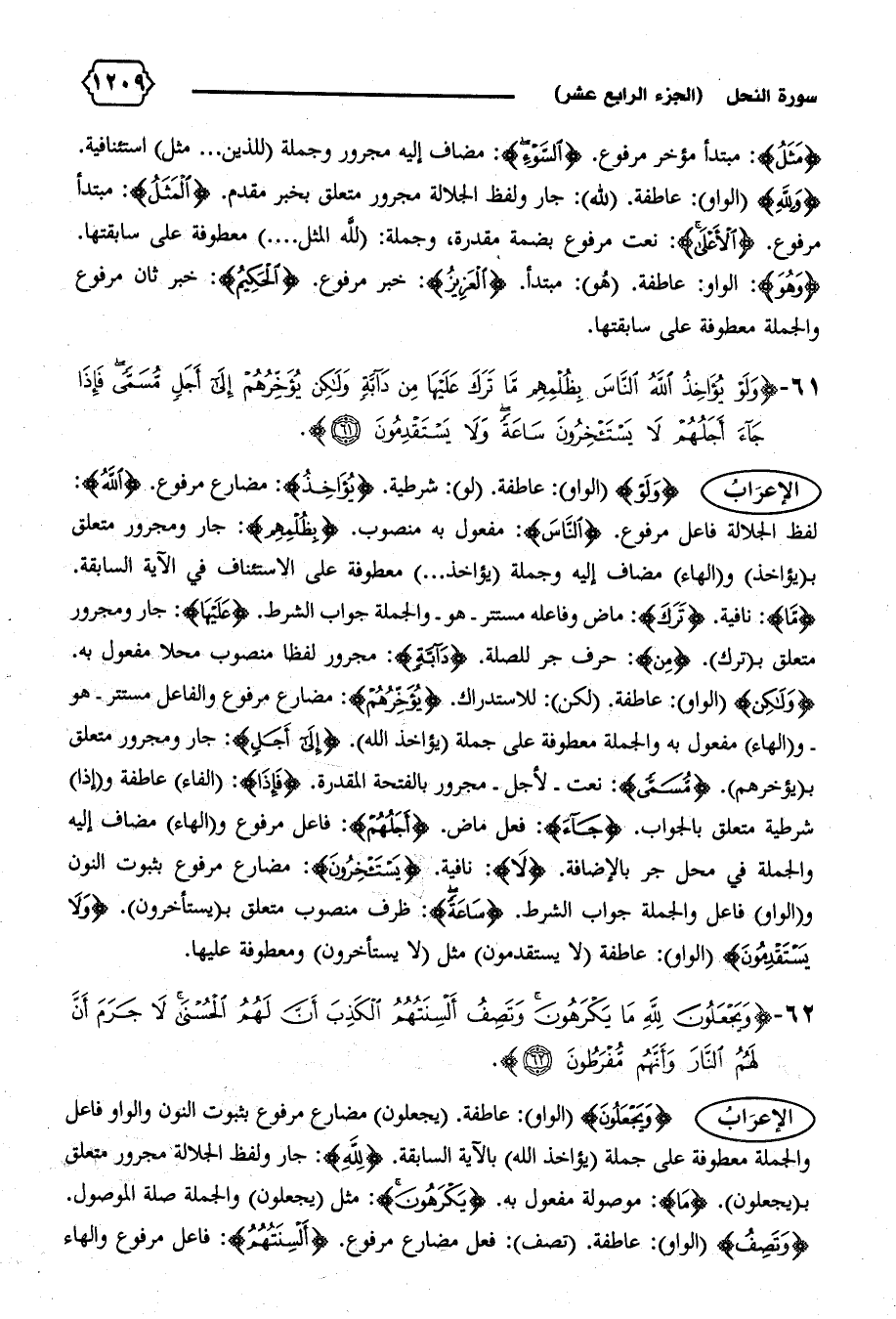 {وَلكِنْ} (الواو): عاطفة. (لكن): للاستدراك. {يُؤَخِّرُهُمْ}: مضارع مرفوع والفاعل مستتر-هو -و (الهاء) مفعول به والجملة معطوفة على جملة (يؤاخذ الله). {إِلى أَجَلٍ}: جار ومجرور متعلق ب (يؤخرهم). {مُسَمًّى}: نعت-لأجل-مجرور بالفتحة المقدرة. {فَإِذا}: (الفاء) عاطفة و (إذا) شرطية متعلق بالجواب. {جاءَ}: فعل ماض. {أَجَلُهُمْ}: فاعل مرفوع و (الهاء) مضاف إليه والجملة في محل جر بالإضافة. {لا}: نافية. {يَسْتَأْخِرُونَ}: مضارع مرفوع بثبوت النون و (الواو) فاعل والجملة جواب الشرط. {ساعَةً}: ظرف منصوب متعلق ب (يستأخرون). {وَلا يَسْتَقْدِمُونَ} (الواو): عاطفة (لا يستقدمون) مثل (لا يستأخرون) ومعطوفة عليها.