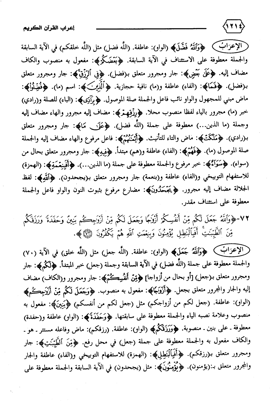 ماض مبني للمجهول والواو نائب فاعل والجملة صلة الموصول. {بِرَادِّي}: (الباء) للصلة و (رادي) خبر (ما) مجرور بالياء لفظا منصوب محلا. {رِزْقِهِمْ}: مضاف إليه مجرور والهاء مضاف إليه وجملة (ما الذين ... ) معطوفة على جملة (الله فضل). {عَلى ما}: جار ومجرور متعلق ب (رادي). {مَلَكَتْ}: ماض والتاء للتأنيث. {أَيْمانُهُمْ}: فاعل مرفوع والهاء مضاف إليه والجملة صلة الموصول (ما). {فَهُمْ}: (الفاء) عاطفة و (هم) مبتدأ. {فِيهِ}: جار ومجرور متعلق بحال من (سواء). {سَواءٌ}: خبر مرفوع والجملة معطوفة على جملة (ما الذين ... ). {أَفَبِنِعْمَةِ}: (الهمزة) للاستفهام التوبيخي و (الفاء) عاطفة و (بنعمة) جار ومجرور متعلق ب (يجحدون). {اللهُ}: لفظ الجلالة مضاف إليه مجرور. {يَجْحَدُونَ}: مضارع مرفوع بثبوت النون والواو فاعل والجملة معطوفة على استئناف مقدر.