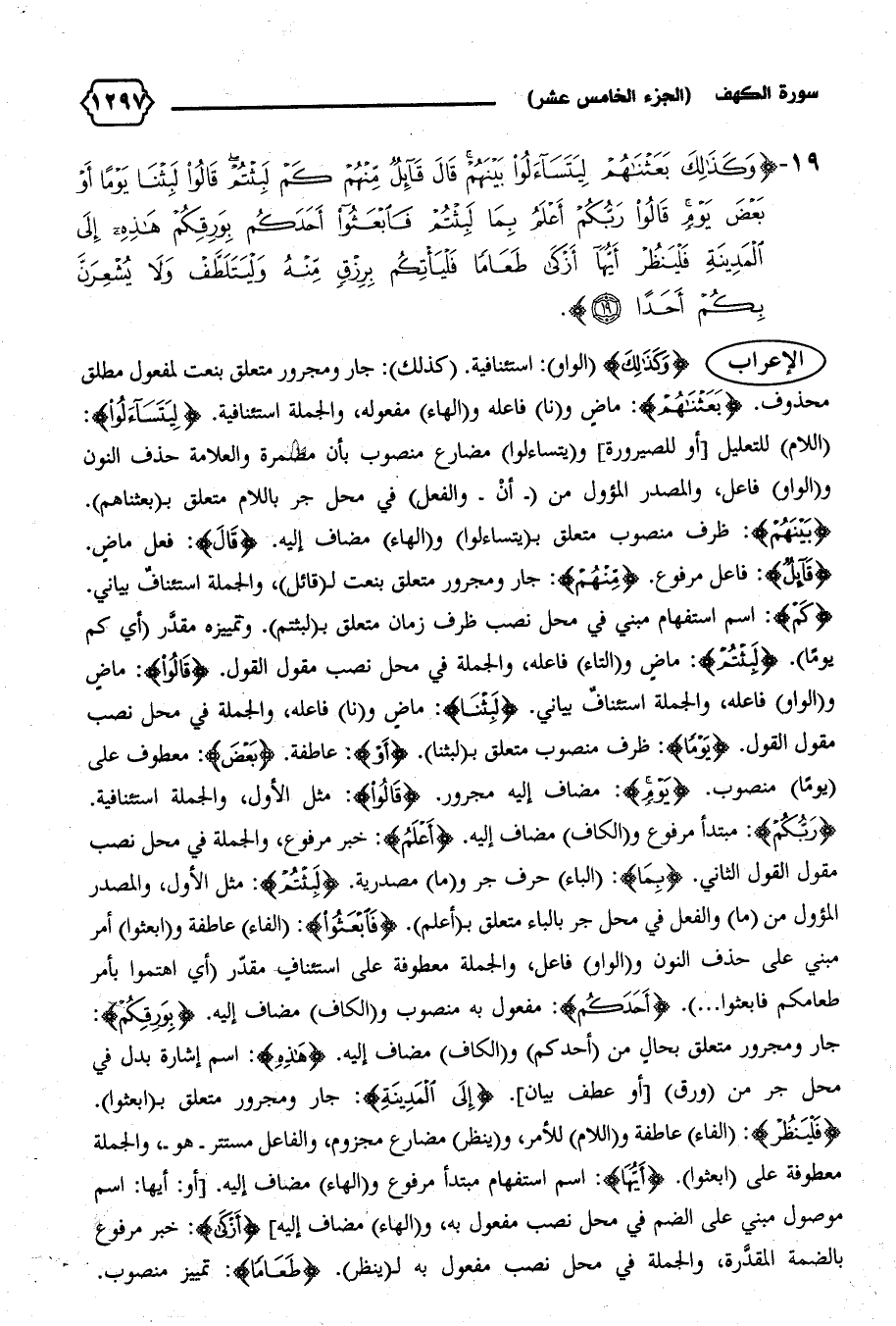 {وَكَذلِكَ بَعَثْناهُمْ لِيَتَساءَلُوا بَيْنَهُمْ قالَ قائِلٌ مِنْهُمْ كَمْ لَبِثْتُمْ قالُوا لَبِثْنا يَوْماً أَوْ بَعْضَ يَوْمٍ قالُوا رَبُّكُمْ أَعْلَمُ بِما لَبِثْتُمْ فَابْعَثُوا أَحَدَكُمْ بِوَرِقِكُمْ هذِهِ إِلَى الْمَدِينَةِ فَلْيَنْظُرْ أَيُّها أَزْكى طَعاماً فَلْيَأْتِكُمْ بِرِزْقٍ مِنْهُ وَلْيَتَلَطَّفْ وَلا يُشْعِرَنَّ بِكُمْ أَحَداً (١٩)}