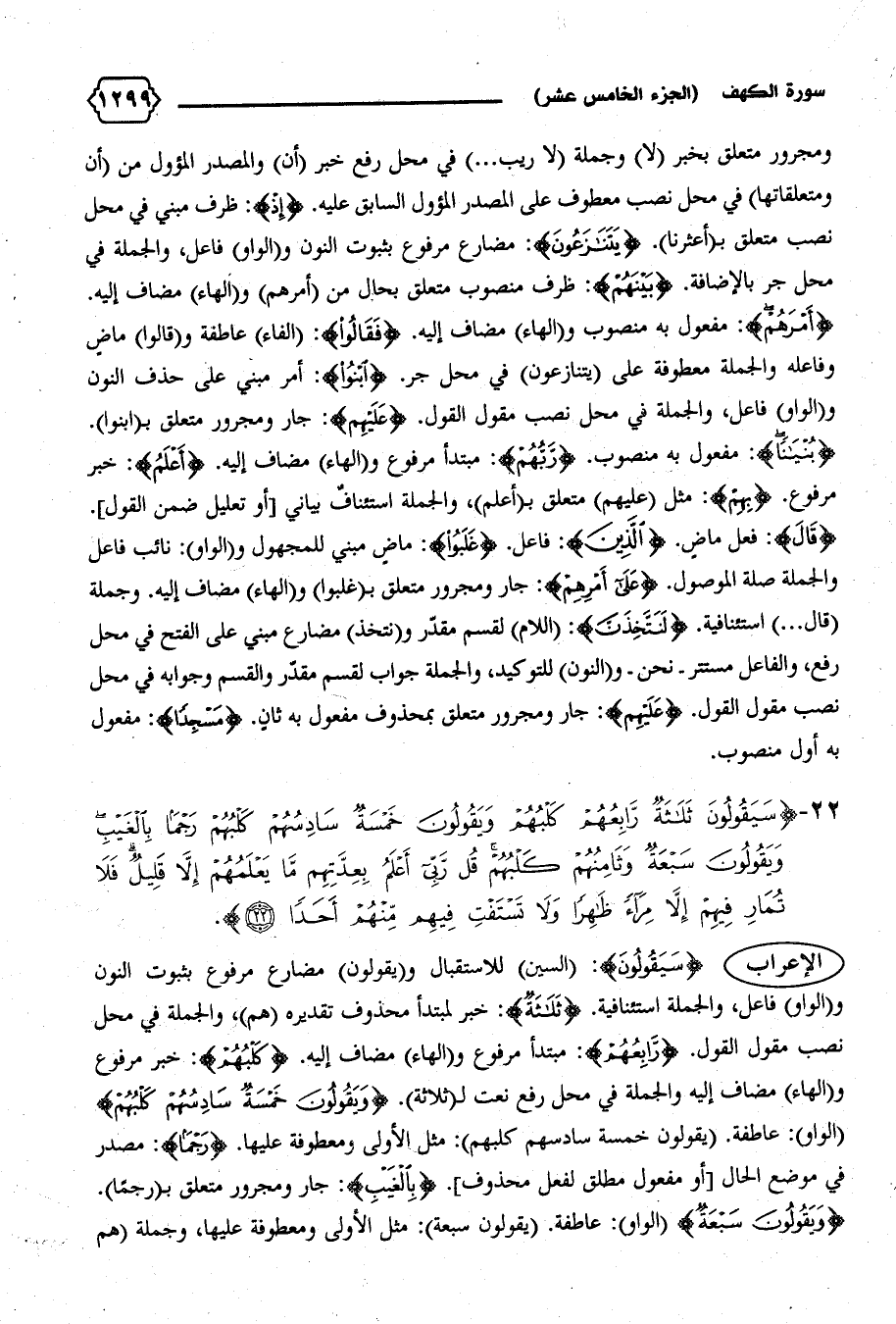الإعراب {سَيَقُولُونَ}: (السين) للاستقبال و (يقولون) مضارع مرفوع بثبوت النون و (الواو) فاعل، والجملة استئنافية. {ثَلاثَةٌ}: خبر لمبتدإ محذوف تقديره (هم)، والجملة في محل نصب مقول القول. {رابِعُهُمْ}: مبتدأ مرفوع و (الهاء) مضاف إليه. {كَلْبُهُمْ}: خبر مرفوع و (الهاء) مضاف إليه والجملة في محل رفع نعت ل (ثلاثة). {وَيَقُولُونَ خَمْسَةٌ سادِسُهُمْ كَلْبُهُمْ} (الواو): عاطفة. (يقولون خمسة سادسهم كلبهم): مثل الأولى ومعطوفة عليها. {رَجْماً}: مصدر في موضع الحال [أو مفعول مطلق لفعل محذوف]. {بِالْغَيْبِ}: جار ومجرور متعلق ب (رجما).