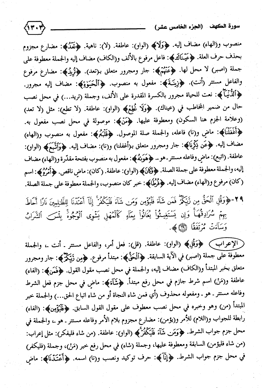 الإعراب {وَقُلِ} (الواو): عاطفة. (قل): فعل أمر، والفاعل مستتر-أنت-، والجملة معطوفة على جملة (اصبر) في الآية السابقة. {الْحَقُّ}: مبتدأ مرفوع. {مِنْ رَبِّكُمْ}: جار ومجرور متعلق بخبر المبتدأ و (الكاف) مضاف إليه، والجملة في محل نصب مقول القول. {فَمَنْ}: (الفاء) عاطفة و (من) اسم شرط جازم في محل رفع مبتدأ. {شاءَ}: ماض في محل جزم فعل الشرط وفاعله مستتر-هو-ومفعوله محذوف (أي فمن شاء النجاة أو من شاء اتباع الحق ... ) والجملة خبر المبتدأ (من) وهو وخبره في محل نصب معطوف على مقول القول السابق. {فَلْيُؤْمِنْ}: (الفاء) رابطة للجواب و (اللام) للأمر و (يؤمن): مضارع مجزوم بلام الأمر وفاعله مستتر-هو-، والجملة في محل جزم جواب الشرط. {وَمَنْ شاءَ فَلْيَكْفُرْ} (الواو): عاطفة. (من شاء فليفكر): مثل إعراب:
