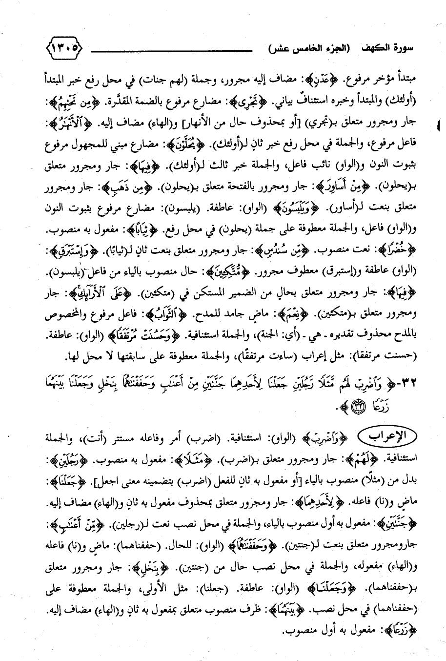 جار ومجرور متعلق بنعت ل (جنتين). {وَحَفَفْناهُما} (الواو): للحال. (حففناهما): ماض و (نا) فاعله و (الهاء) مفعوله، والجملة في محل نصب حال من (جنتين). {بِنَخْلٍ}: جار ومجرور متعلق ب (حففناهما). {وَجَعَلْنا} (الواو): عاطفة. (جعلنا): مثل الأولى، والجملة معطوفة على (حففناهما) في محل نصب. {بَيْنَهُما}: ظرف منصوب متعلق بمفعول به ثان و (الهاء) مضاف إليه.