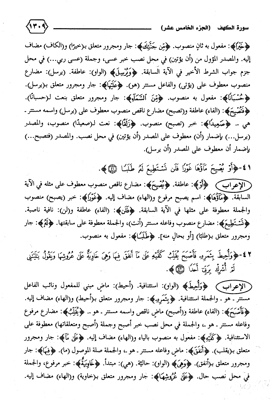 الإعراب {أَوْ}: عاطفة. {يُصْبِحَ}: مضارع ناقص منصوب معطوف على مثله في الآية السابقة. {ماؤُها}: اسم يصبح مرفوع و (الهاء) مضاف إليه. {غَوْراً}: خبر (يصبح) منصوب والجملة معطوفة على مثلها في الآية السابقة. {فَلَنْ}: (الفاء) عاطفة و (لن): نافية ناصبة.