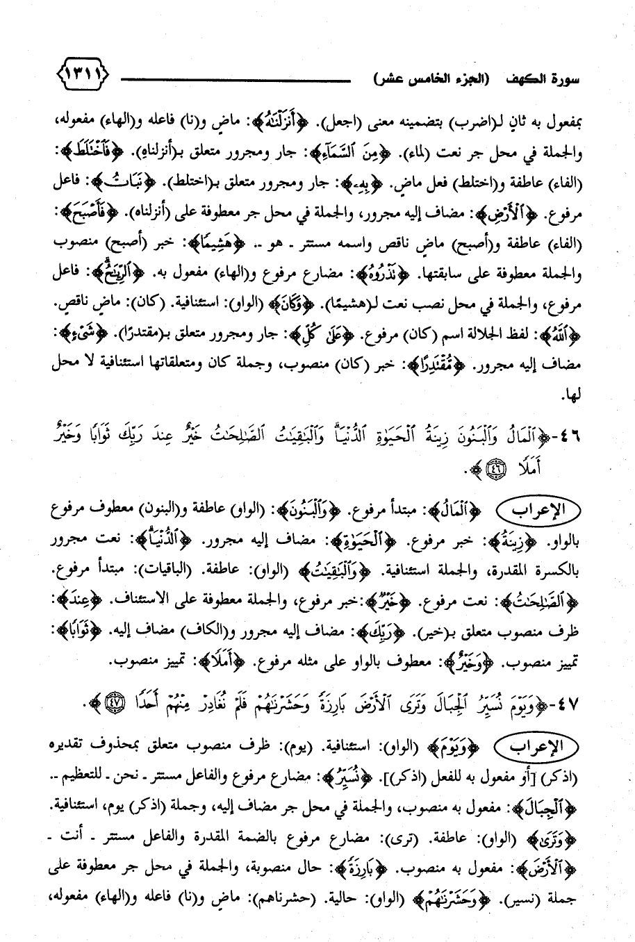 (الفاء) عاطفة و (أصبح) ماض ناقص واسمه مستتر-هو-. {هَشِيماً}: خبر (أصبح) منصوب والجملة معطوفة على سابقتها. {تَذْرُوهُ}: مضارع مرفوع و (الهاء) مفعول به. {الرِّياحُ}: فاعل مرفوع، والجملة في محل نصب نعت ل (هشيما). {وَكانَ} (الواو): استئنافية. (كان): ماض ناقص.