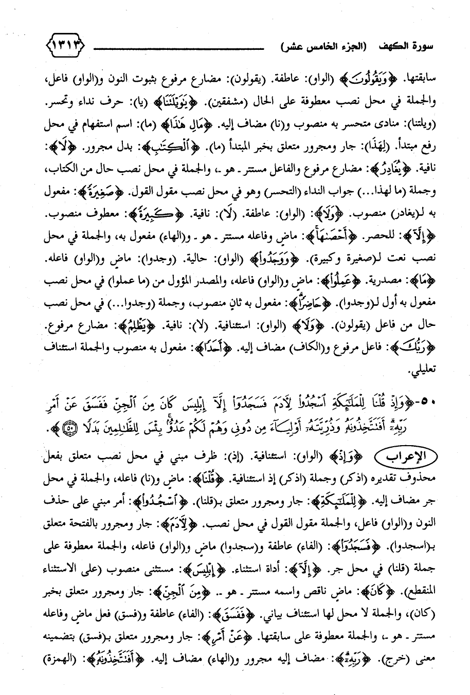الإعراب {وَإِذْ} (الواو): استئنافية. (إذ): ظرف مبني في محل نصب متعلق بفعل محذوف تقديره (اذكر) وجملة (اذكر) إذ استئنافية. {قُلْنا}: ماض و (نا) فاعله، والجملة في محل جر مضاف إليه. {لِلْمَلائِكَةِ}: جار ومجرور متعلق ب (قلنا). {اُسْجُدُوا}: أمر مبني على حذف النون و (الواو) فاعل، والجملة مقول القول في محل نصب. {لِآدَمَ}: جار ومجرور بالفتحة متعلق ب (اسجدوا). {فَسَجَدُوا}: (الفاء) عاطفة و (سجدوا) ماض و (الواو) فاعله، والجملة معطوفة على جملة (قلنا) في محل جر. {إِلاّ}: أداة استثناء. {إِبْلِيسَ}: مستثنى منصوب (على الاستثناء المنقطع). {كانَ}: ماض ناقص واسمه مستتر-هو-. {مِنَ الْجِنِّ}: جار ومجرور متعلق بخبر (كان)، والجملة لا محل لها استئناف بياني. {فَفَسَقَ}: (الفاء) عاطفة و (فسق) فعل ماض وفاعله مستتر-هو-، والجملة معطوفة على سابقتها. {عَنْ أَمْرِ}: جار ومجرور متعلق ب (فسق) بتضمينه معنى (خرج). {رَبِّهِ}: مضاف إليه مجرور و (الهاء) مضاف إليه. {أَفَتَتَّخِذُونَهُ}: (الهمزة)