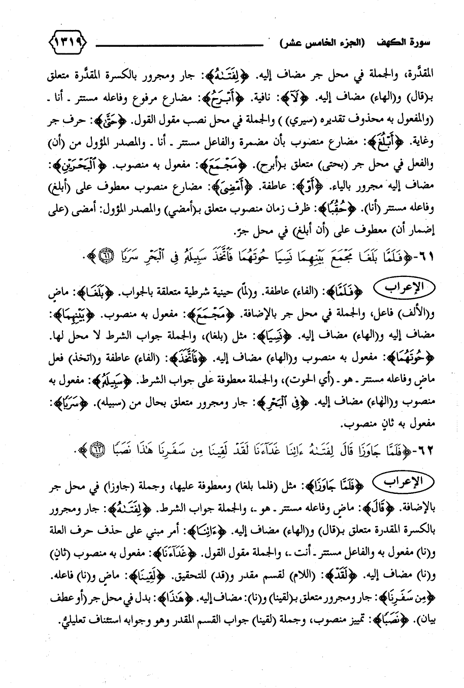 الإعراب {فَلَمّا جاوَزا}: مثل (فلما بلغا) ومعطوفة عليها، وجملة (جاوزا) في محل جر بالإضافة. {قالَ}: ماض وفاعله مستتر-هو-، والجملة جواب الشرط. {لِفَتاهُ}: جار ومجرور بالكسرة المقدرة متعلق ب (قال) و (الهاء) مضاف إليه. {آتِنا}: أمر مبني على حذف حرف العلة و (نا) مفعول به والفاعل مستتر-أنت-، والجملة مقول القول. {غَداءَنا}: مفعول به منصوب (ثان) و (نا) مضاف إليه. {لَقَدْ}: (اللام) لقسم مقدر و (قد) للتحقيق. {لَقِينا}: ماض و (نا) فاعله.