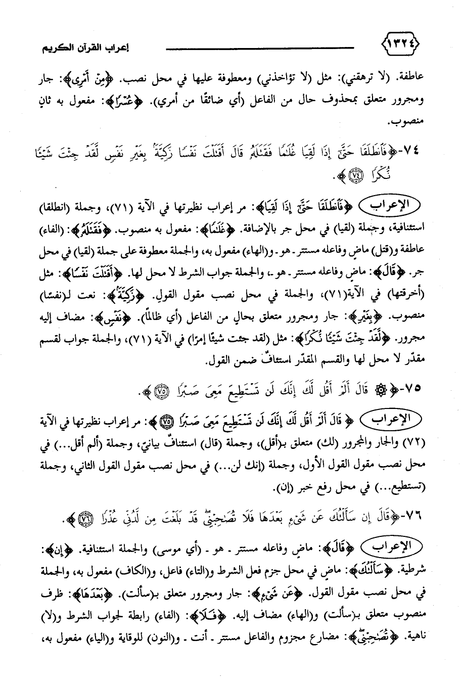 الإعراب {فَانْطَلَقا حَتّى إِذا لَقِيا}: مر إعراب نظيرتها في الآية (٧١)، وجملة (انطلقا) استئنافية، وجملة (لقيا) في محل جر بالإضافة. {غُلاماً}: مفعول به منصوب. {فَقَتَلَهُ}: (الفاء) عاطفة و (قتل) ماض وفاعله مستتر-هو-و (الهاء) مفعول به، والجملة معطوفة على جملة (لقيا) في محل جر. {قالَ}: ماض وفاعله مستتر-هو-، والجملة جواب الشرط لا محل لها. {أَقَتَلْتَ نَفْساً}: مثل (أخرقتها) في الآية (٧١)، والجملة في محل نصب مقول القول. {زَكِيَّةً}: نعت ل (نفسا) منصوب. {بِغَيْرِ}: جار ومجرور متعلق بحال من الفاعل (أي ظالما). {نَفْسٍ}: مضاف إليه مجرور. {لَقَدْ جِئْتَ شَيْئاً نُكْراً}: مثل (لقد جئت شيئا إمرا) في الآية (٧١)، والجملة جواب لقسم مقدّر لا محل لها والقسم المقدّر استئناف ضمن القول.